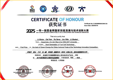 2025年3月25日于洋老师的“高温质子交换膜燃料电池小型化技术与产业化”项目在“2025 一带一路暨金砖国家技能发展与技术创新大赛之技术创新赛国内决赛”中获得一等奖。赛道名称:绿色能源。项目编号:BRICS-TI-202503-071。