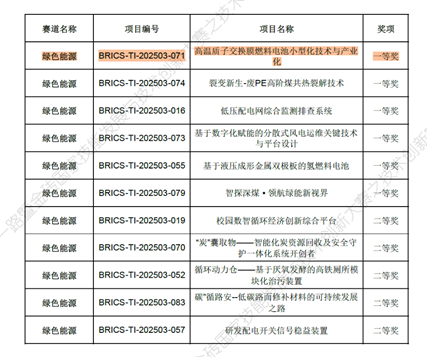 2025年3月25日于洋老师的“高温质子交换膜燃料电池小型化技术与产业化”项目在“2025 一带一路暨金砖国家技能发展与技术创新大赛之技术创新赛国内决赛”中获得一等奖。赛道名称:绿色能源。项目编号:BRICS-TI-202503-071。
