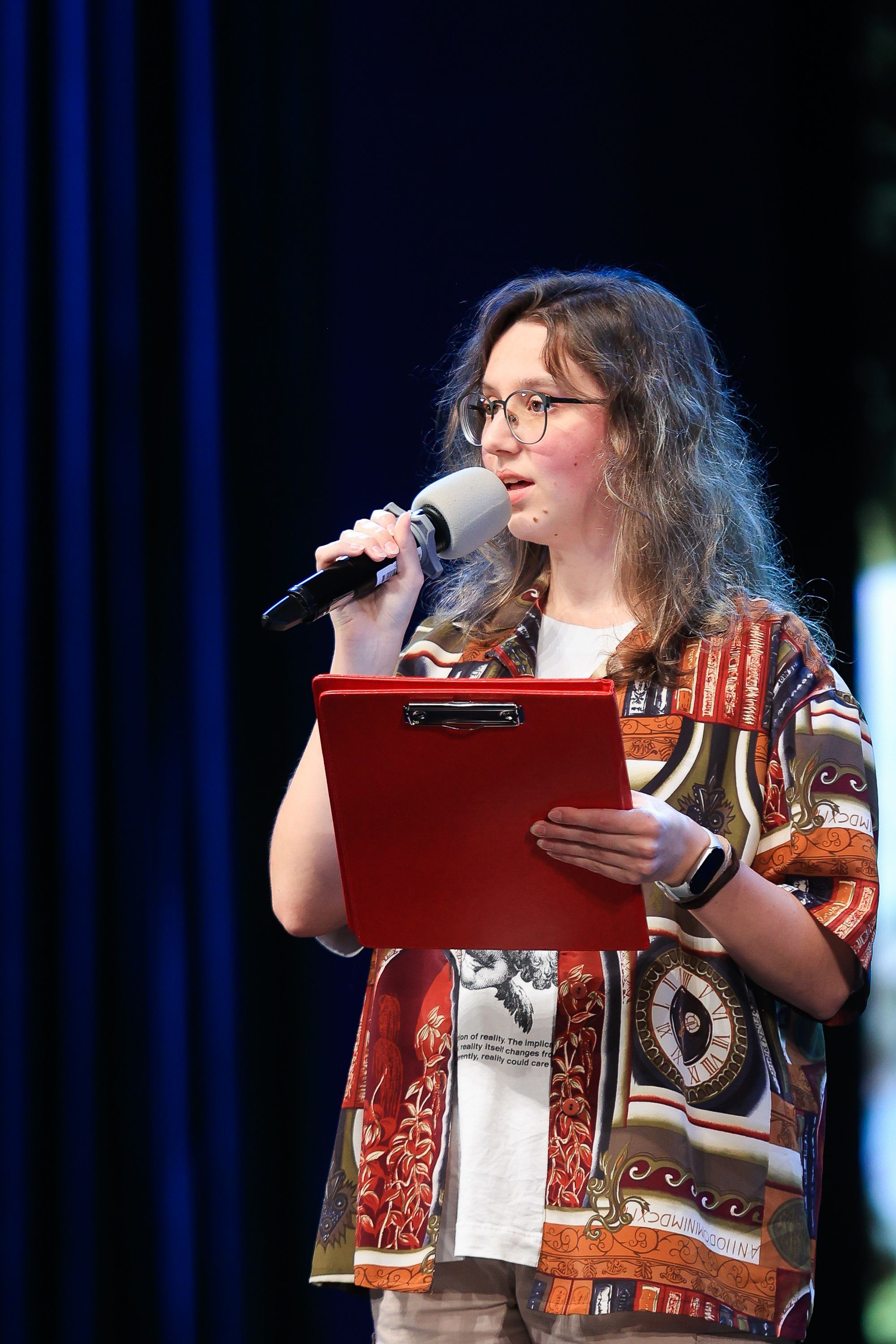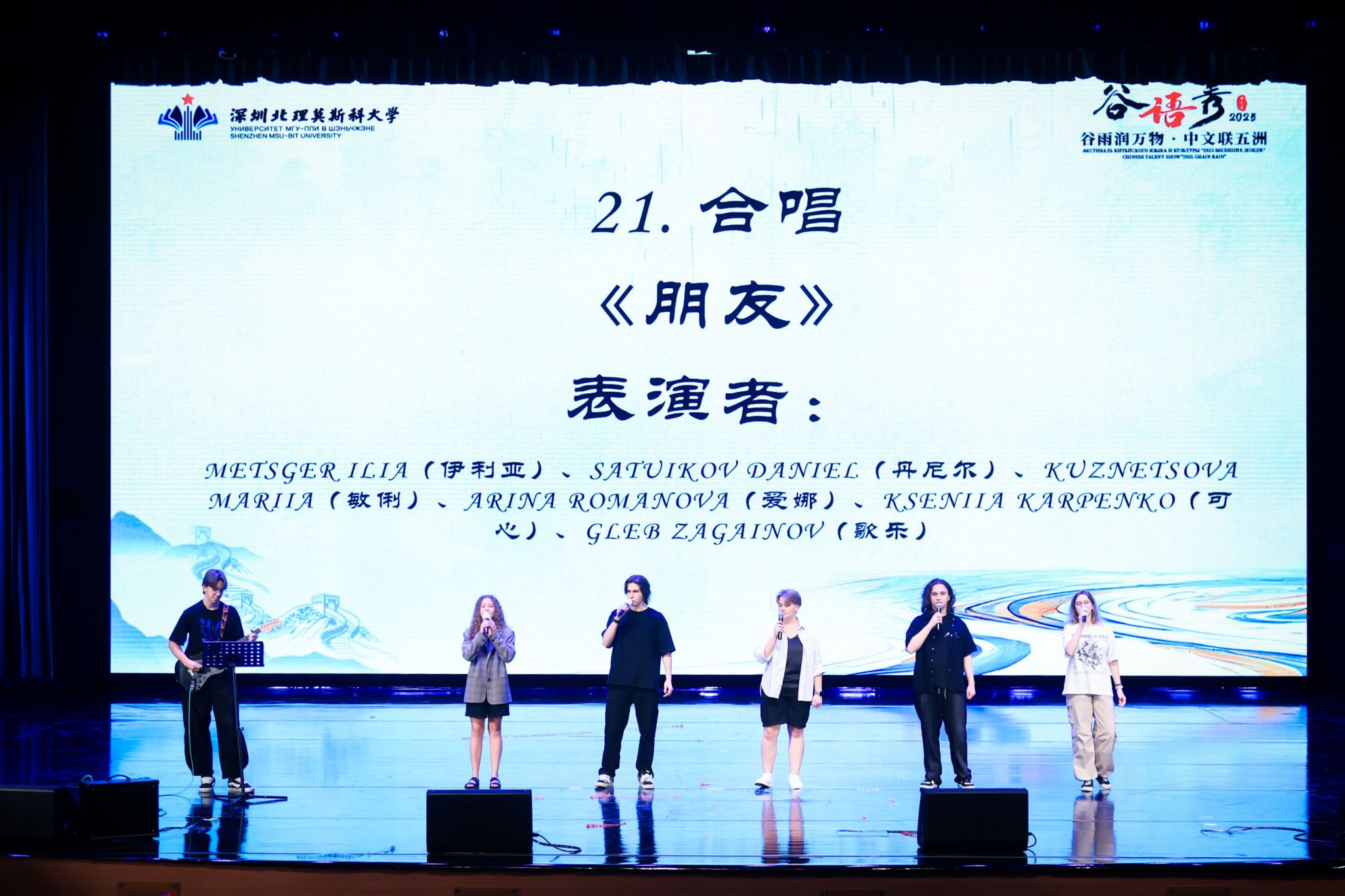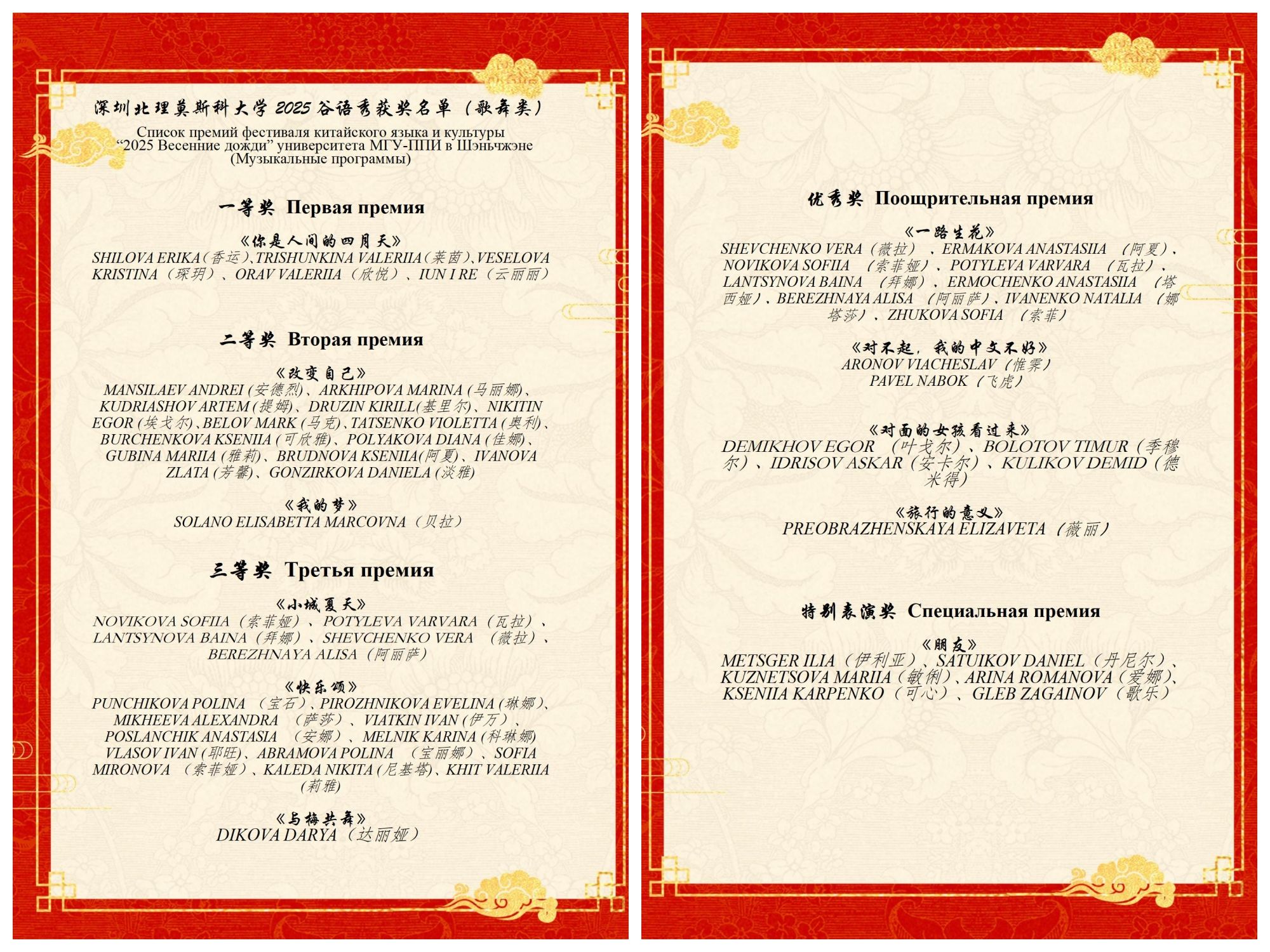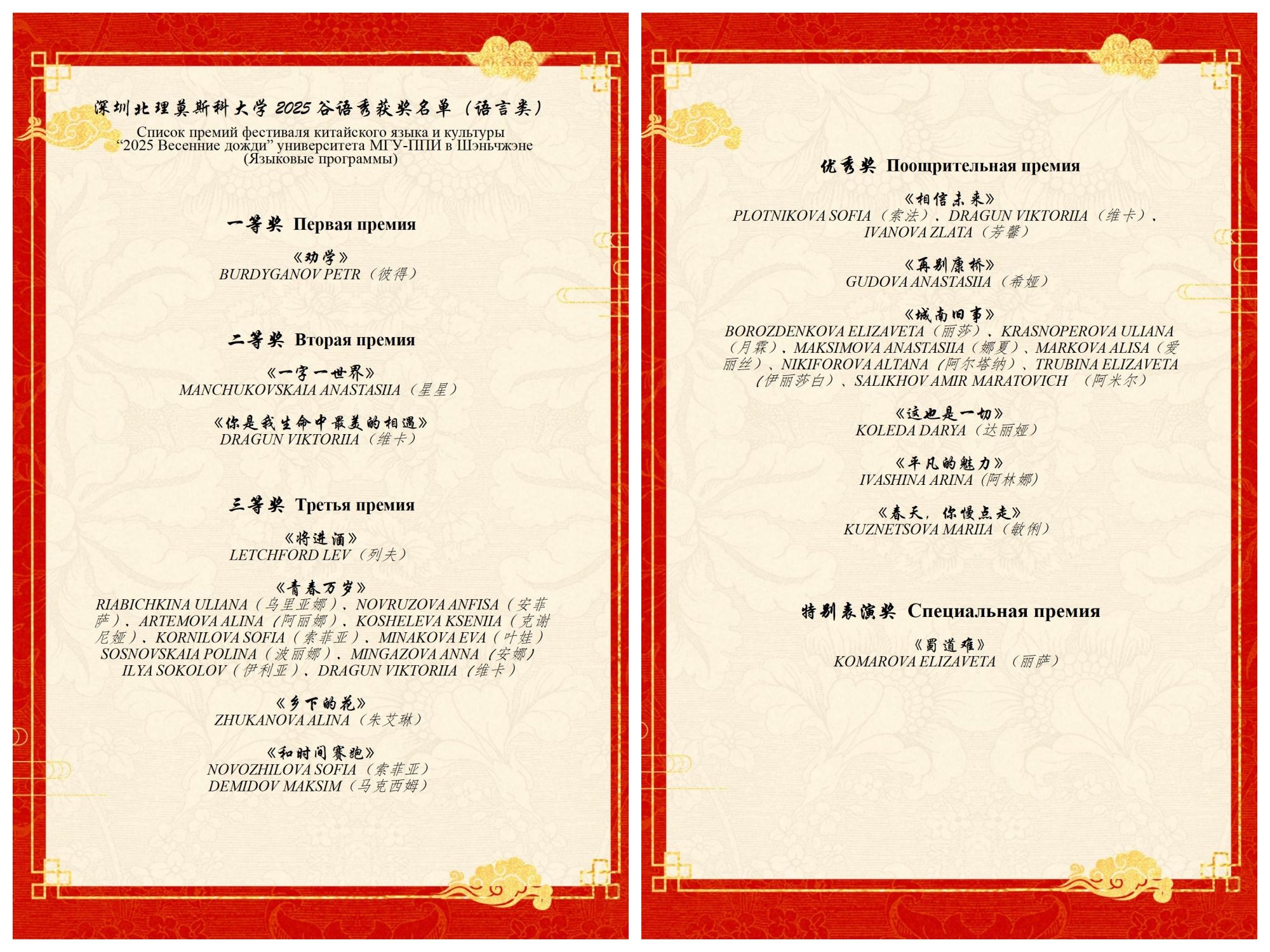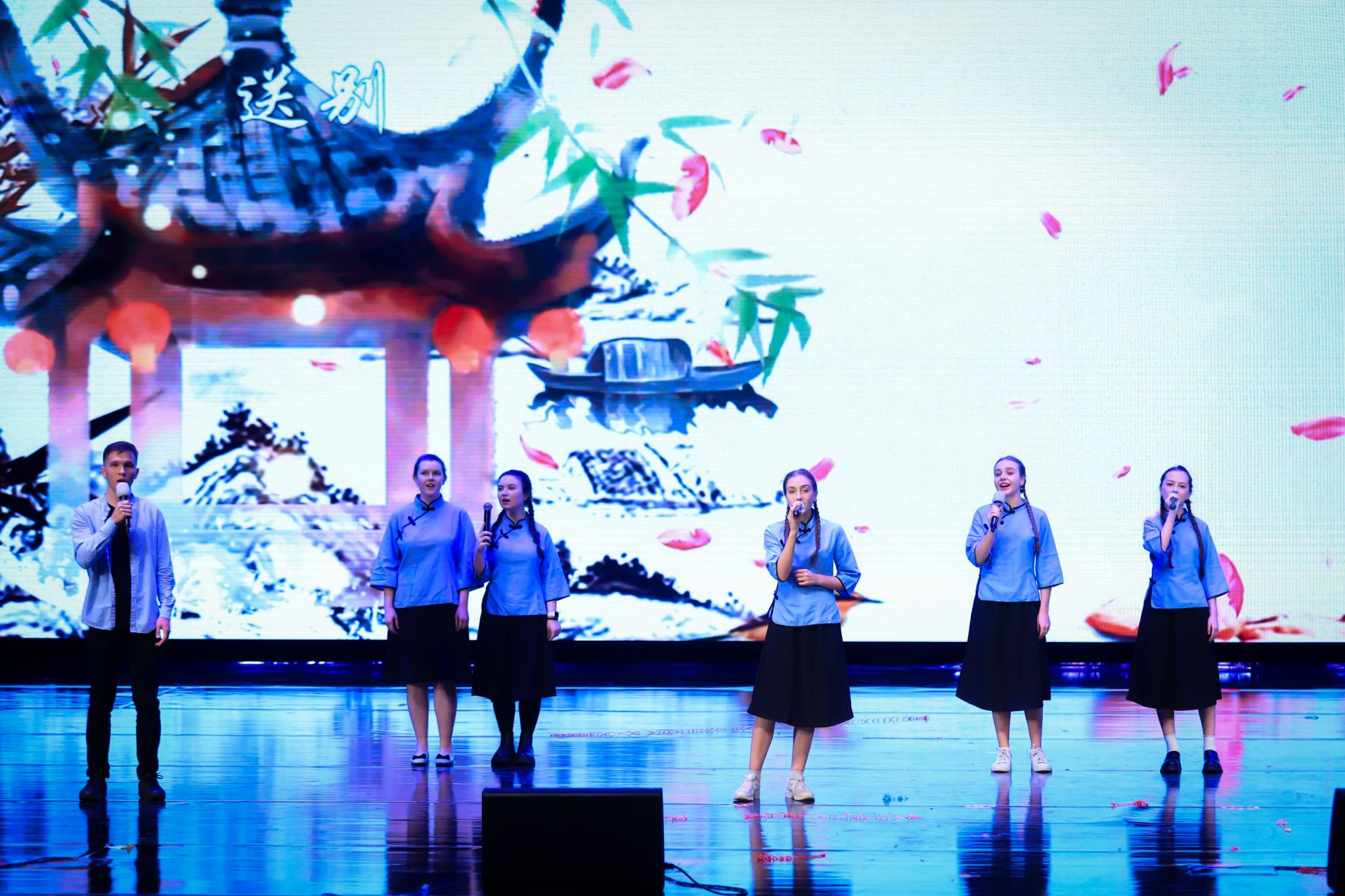 本届谷语秀晚会首次将节目分为语言、歌舞两大类,分别计票评选。经过专家评审和现场观众限时投票,23级汉语言专业BURDYGANOV PETR(彼得)的《劝学》斩获语言类一等奖,24级汉语言专业SHILOVA ERIKA(香运)、TRISHUNKINA VALERIIA(莱茵)、VESELOVA KRISTINA(琛玥)、ORAV VALERIIA(欣悦)、IUN I RE(云丽丽)的《你是人间四月天》荣获歌舞类一等奖。
