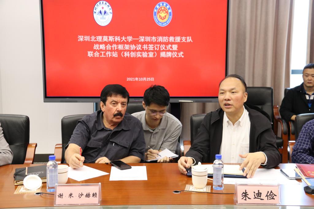 朱迪俭书记表示,学校将充分发挥人才、科技和科研支持,以政企需求为导向加快推进协同创新,建立战略导向的长效合作机制,努力培养创新实用型人才培养模式,更好地服务行业和区域经济发展。沙赫赖第一副校长表示,双方合作大有可为,学校材料科学系可以根据深圳市消防支队的需求研发消防救援领域的特殊材料;中俄边境线漫长,防火救灾工作至关重要,双方可以合作培养掌握中俄双语的消防人才,促进中俄在消防领域的合作。此外,还可以通过合作助力发展中国家的消防安全建设,造福人类社会。