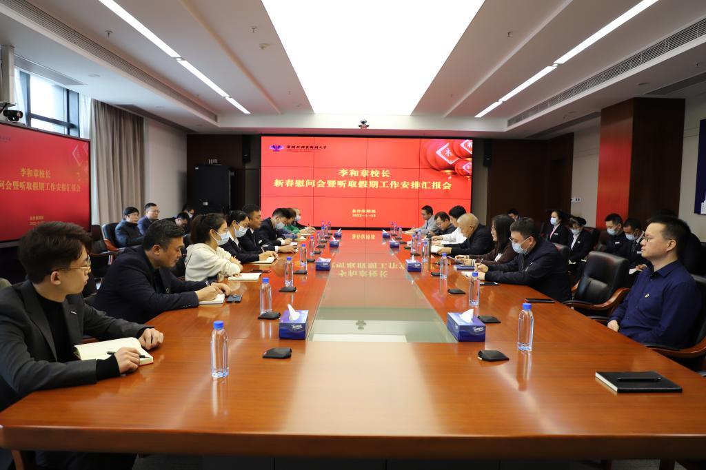 李和章校长听取汇报后,首先向全体工作人员送上了小年祝福以及新春祝福,并对大家过去一年以来在学校安全、防疫、校园服务、基础设施建设与完善等各方面的辛勤付出与取得的成绩表示衷心感谢。之后,李和章校长就学校假期工作强调了以下几点。一是要切实抓好校园安全工作,要树立人人都是安全责任人的意识,高度重视校园消防安全、防盗安全、实验室安全、师生人身安全等方方面面的安全工作,及时排查隐患,确保校园安全稳定。二是切实做好假期校园生活服务保障,为假期留校师生提供贴心、暖心服务。三是利用假期持续推进基础设施建设,合理安排好项目工作进度,要发挥敢打敢拼、敢于作为、始终如一的精神,迎难而上。