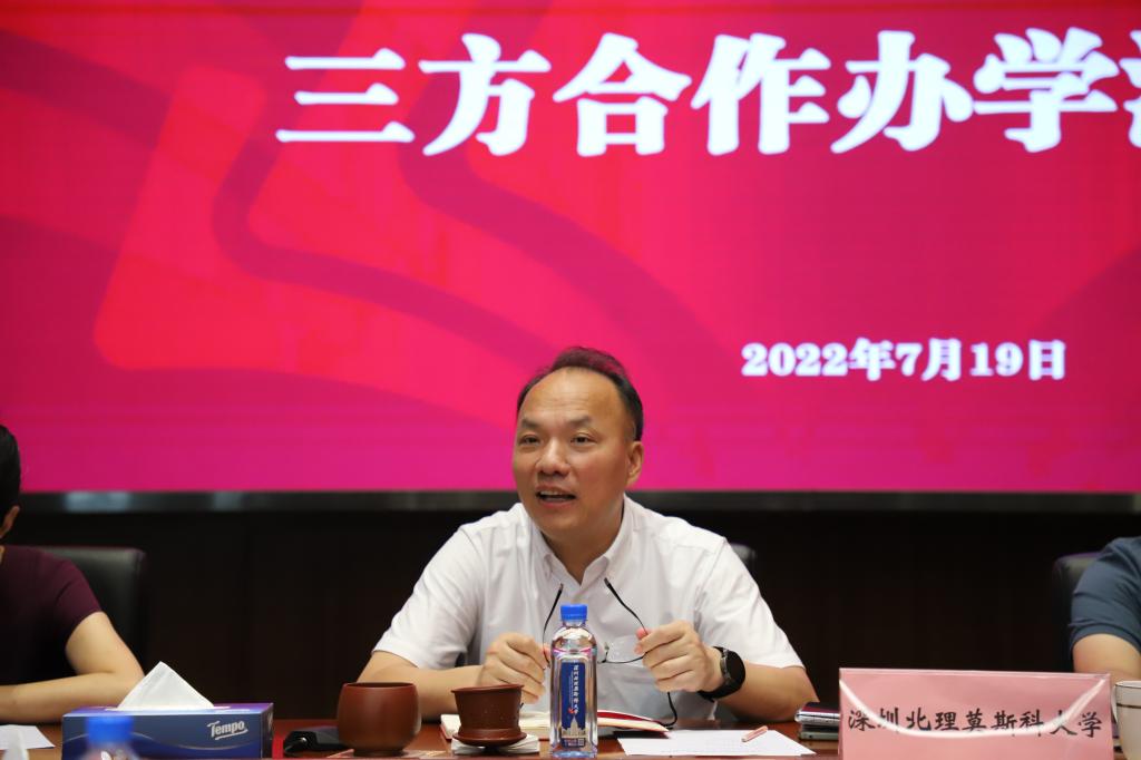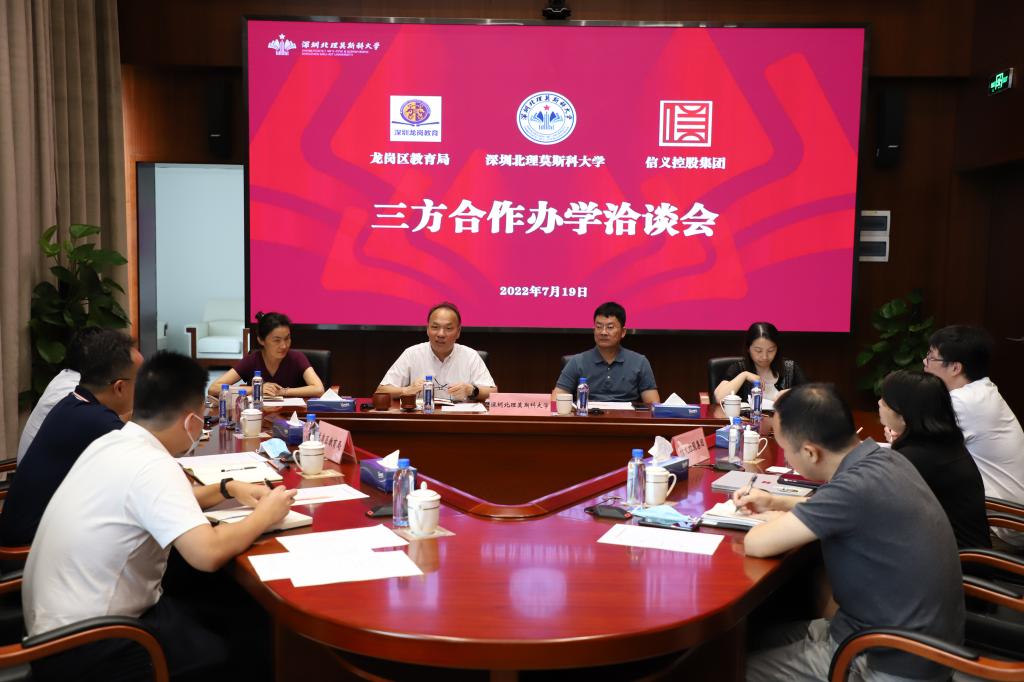 三方合作洽谈会的首席代表分别为:ac米兰官网中文网站党委书记、副校长朱迪俭博士,龙岗区教育局主任督学罗丹先生,深圳市政协委员、信义控股董事李培娅女士。ac米兰官网中文网站条件保障部部长彭巨光教授、计划财务部部长高英女士、组织人力资源部副部长吴映霞女士全程参与。参加会议的还有条件保障部刘永明副部长、余良彬老师。