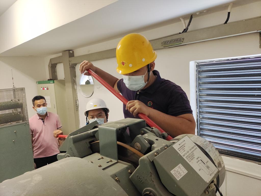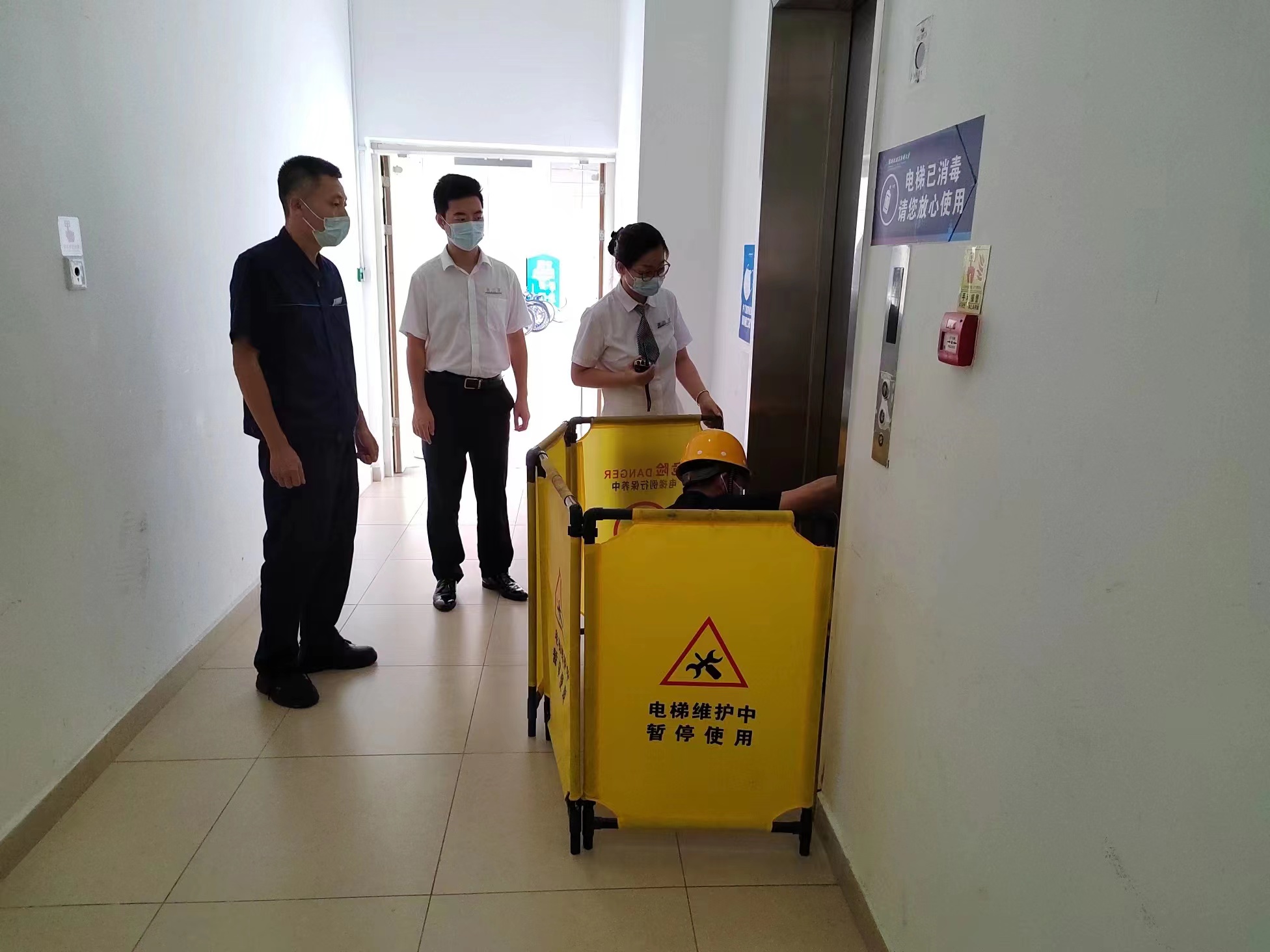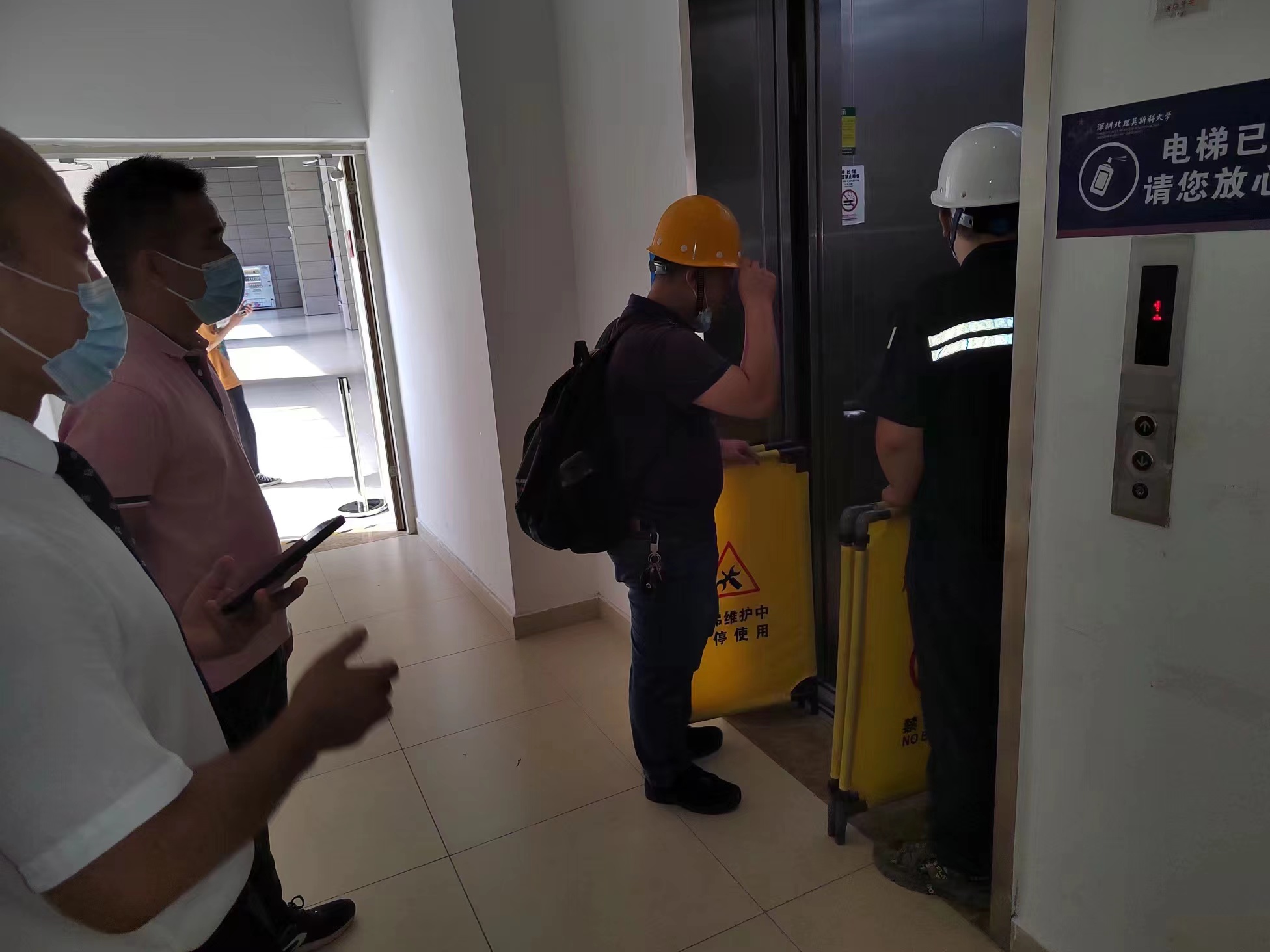 为了加强电梯事故的防范,积极应对可能发生的电梯“困人”故障,提升物业应急处置能力,保障师生乘梯安全。2022年8月18日15:00分,条件保障部组织物业、电梯维保单位,在1号学生宿舍B栋南侧电梯开展了电梯困人应急实战演练。