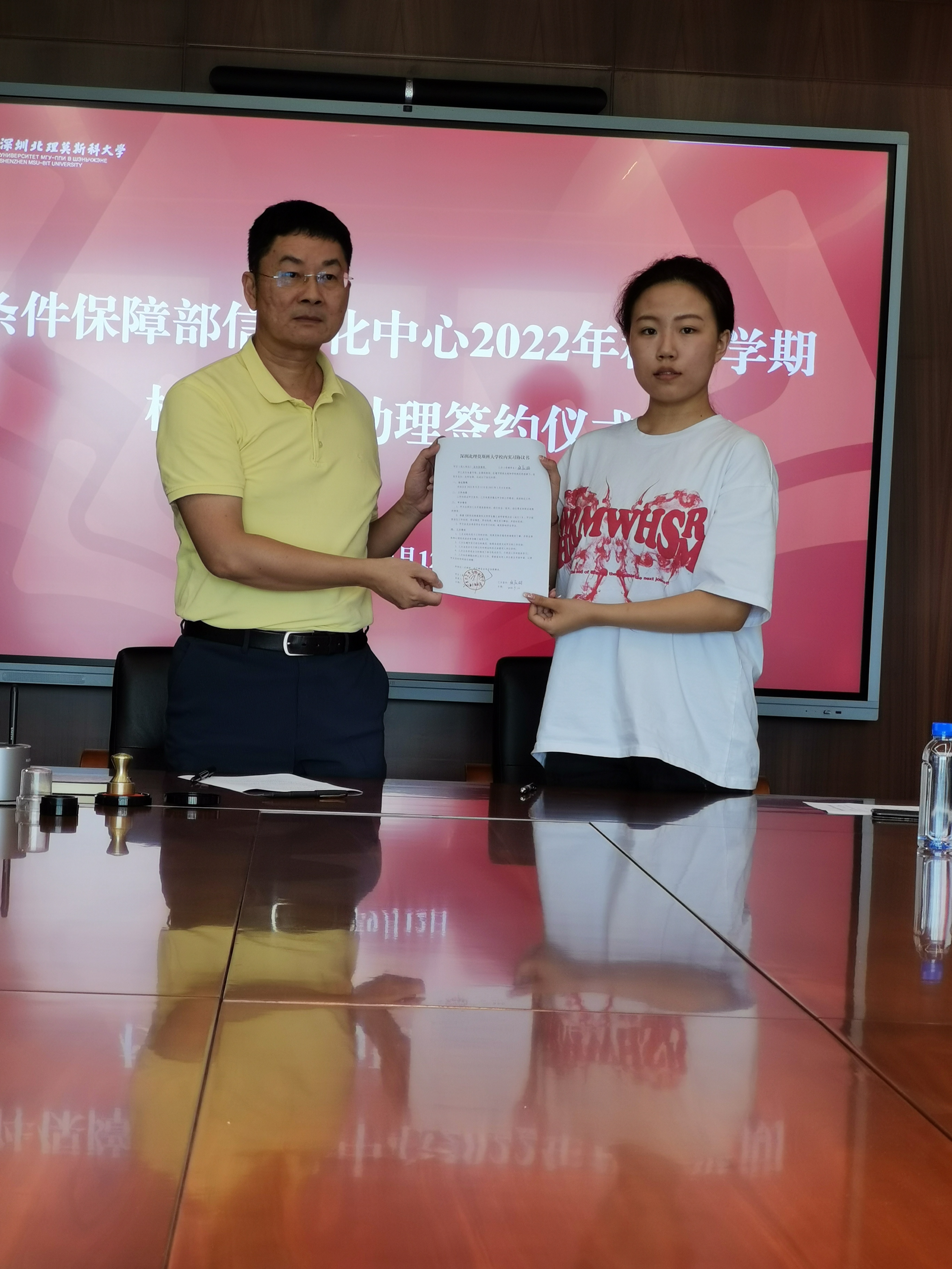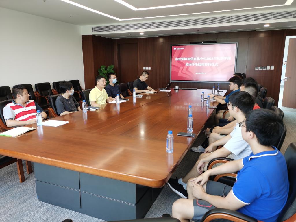 2022年9月12日条件保障部在主楼705会议室举行条件保障部信息化中心2022年秋季学期校内学生助理签约仪式,条件保障部部长彭巨光、信息化办公室主任、条件保障部信息化中心负责人钟南星、信息化中心教职员以及八位新入职学生助理出席签约仪式。