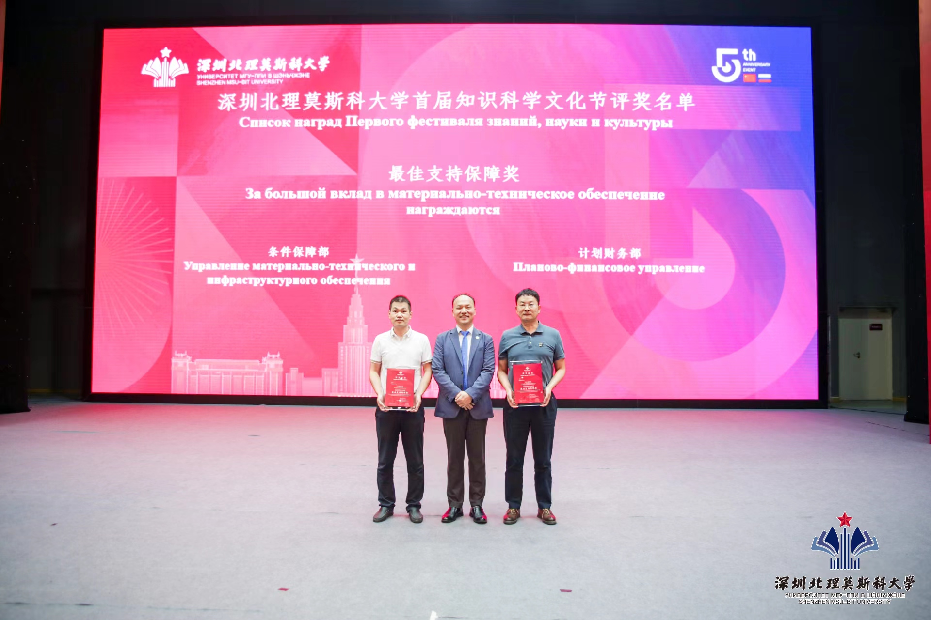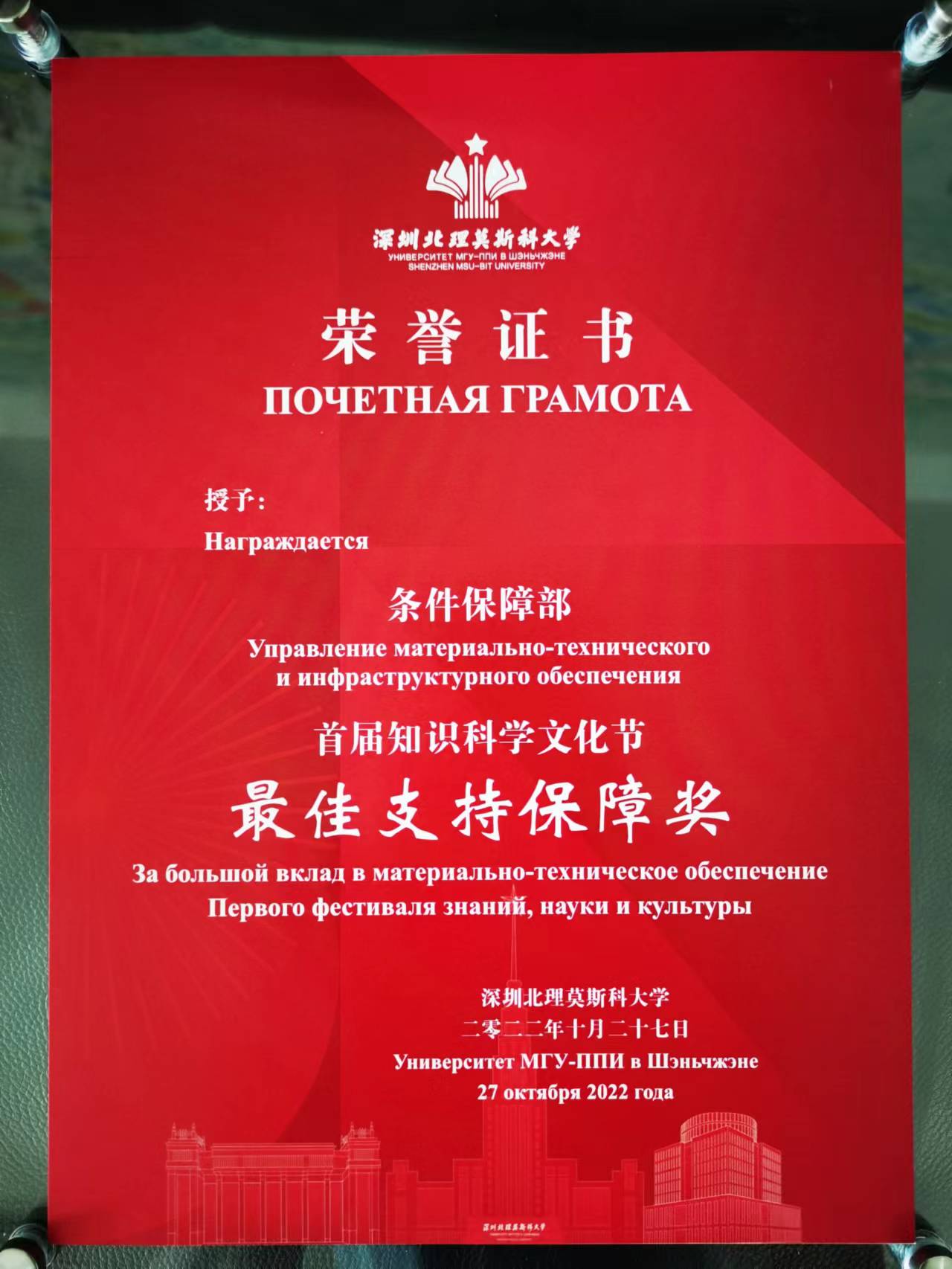 10月27日下午,学校举行庆祝中俄元首致贺辞5周年汇报会暨首届知识科学文化节闭幕式。条件保障部荣获“最佳支持保障奖”,学校党委书记、副校长朱迪俭为条件保障部颁奖。