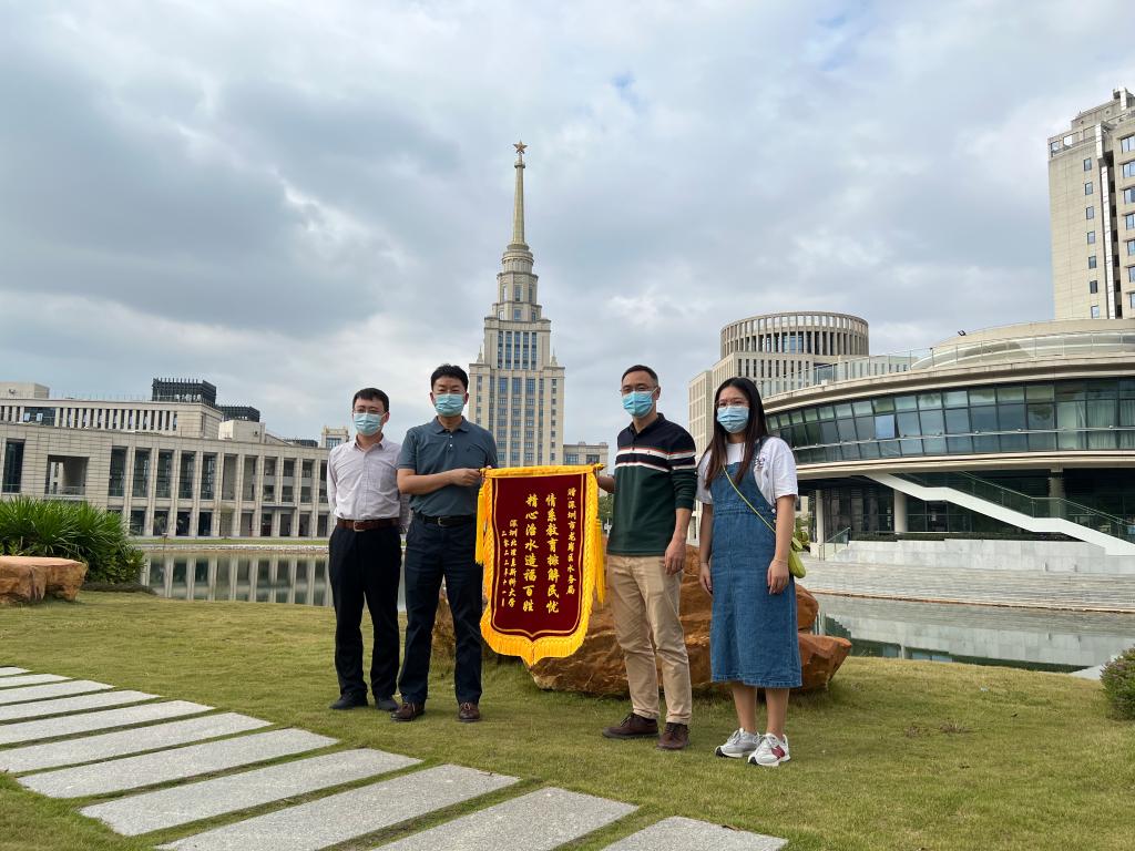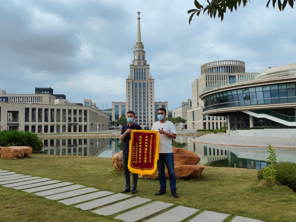 在人工湖畔,彭巨光部长、刘永明副部长代表ac米兰官网中文网站向龙岗区水务局张五岳部长赠送“情系教育拍解民忧 精心治水造福百姓”锦旗。