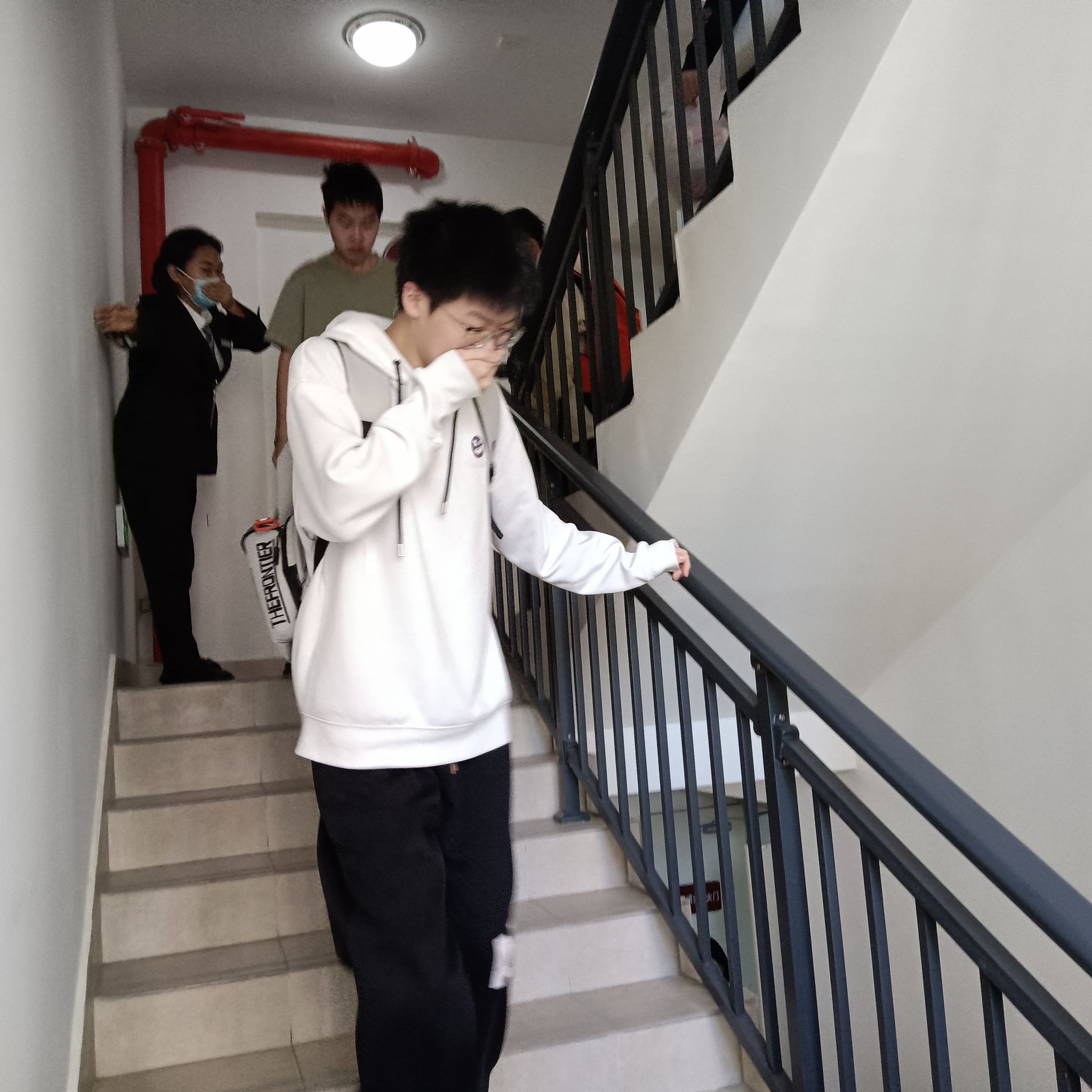 现场模拟2号宿舍楼内发生火灾,急促的火警警报声响彻宿舍楼,浓烟迅速蔓延,火情一经发现,公寓宿管立刻赶赴各楼层,引导学生从消防楼梯快速、有序疏散,沿着学校指定的路线安全撤离到安全地带。