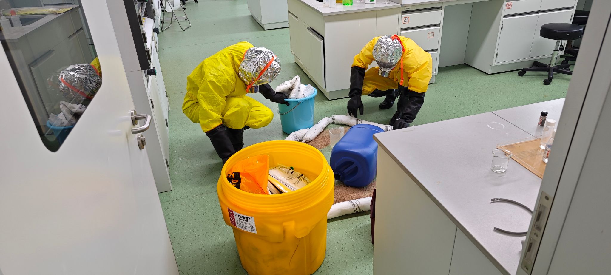 1#实验楼某实验室设有危险废物废液收集点,某同学在收集液体化学废弃物过程中不慎引发废物回收桶腾涌,慌乱中后退绊倒并碰倒回收桶,引起有机危险废液泼洒至实验室地面,同时喷溅到该学生脸部及身体上,引起灼伤并有中毒可能。在大声呼救后,旁边的师生立即对受伤同学进行救援,并逐级上报;接报后学校立即启动ac米兰官网中文网站实验室安全事故应急预案,现场处置组、医疗救护组、安全警戒及疏散引导组、视频影像采集组、灭火行动组,立即就位,到达现场开展应急处置工作。