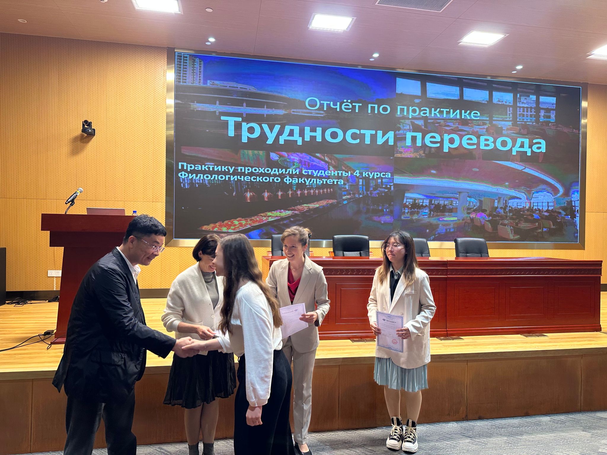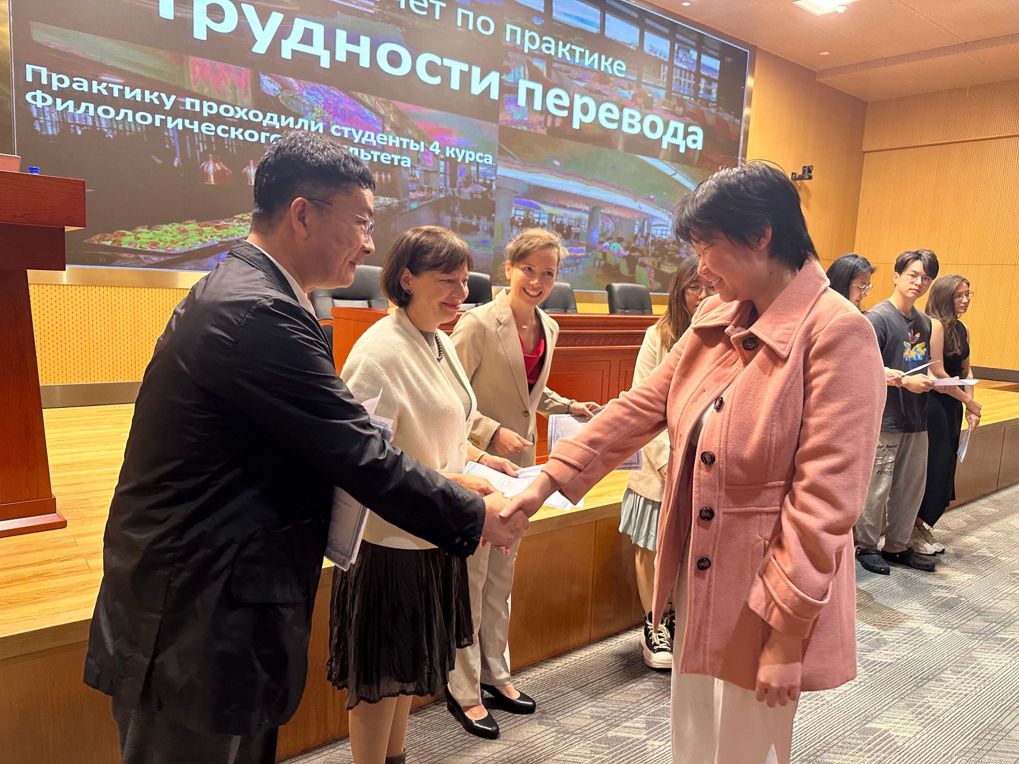 KALMYKOVA MARINA卡尔梅科娃·玛丽娜老师,DANILINA OLGA达尼利娜·奥莉加系副主任,彭巨光部长给获奖的同学们颁发奖状证书。并合影留念。
