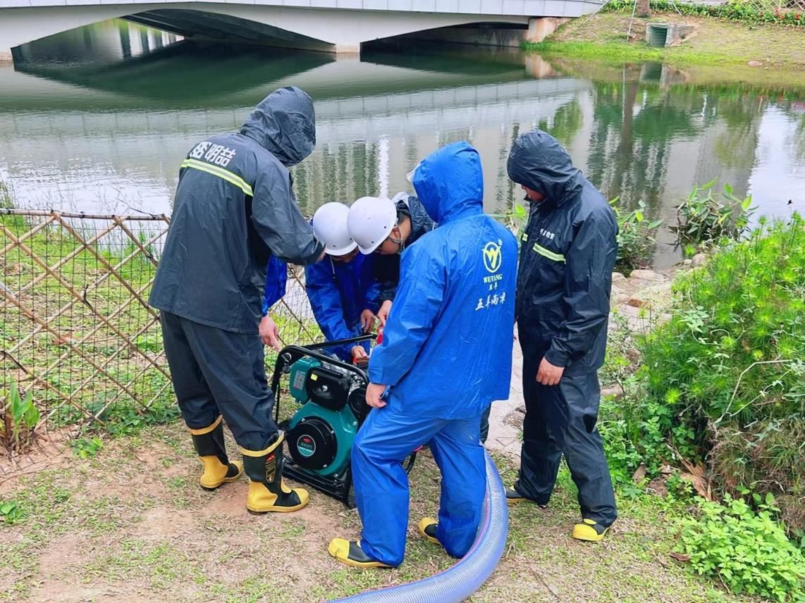 场景一、在演练中,柴油机抽水泵成为关键设备之一。演练人员迅速在人工湖桥边附近接驳水管开机抽水,模拟了积水过多时的紧急排水场景。抽水泵轰鸣作响,强大的水流被迅速抽离积水区域,有效降低了洪涝风险。