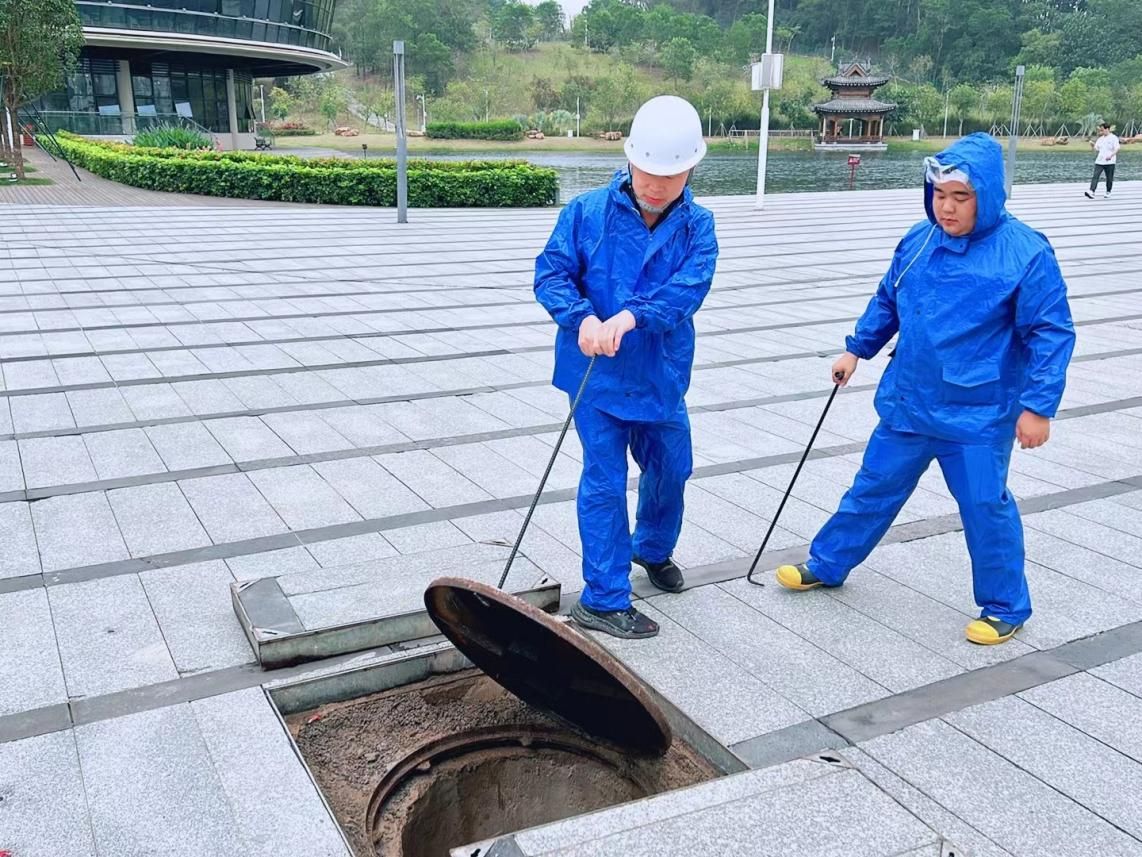 场景二、同时,为加快排水速度,演练人员还打开后广场湖边附近的一个排水井,增加了排水通道,确保积水能够迅速排出。这一举措显著提升了校园排水系统的应对能力。