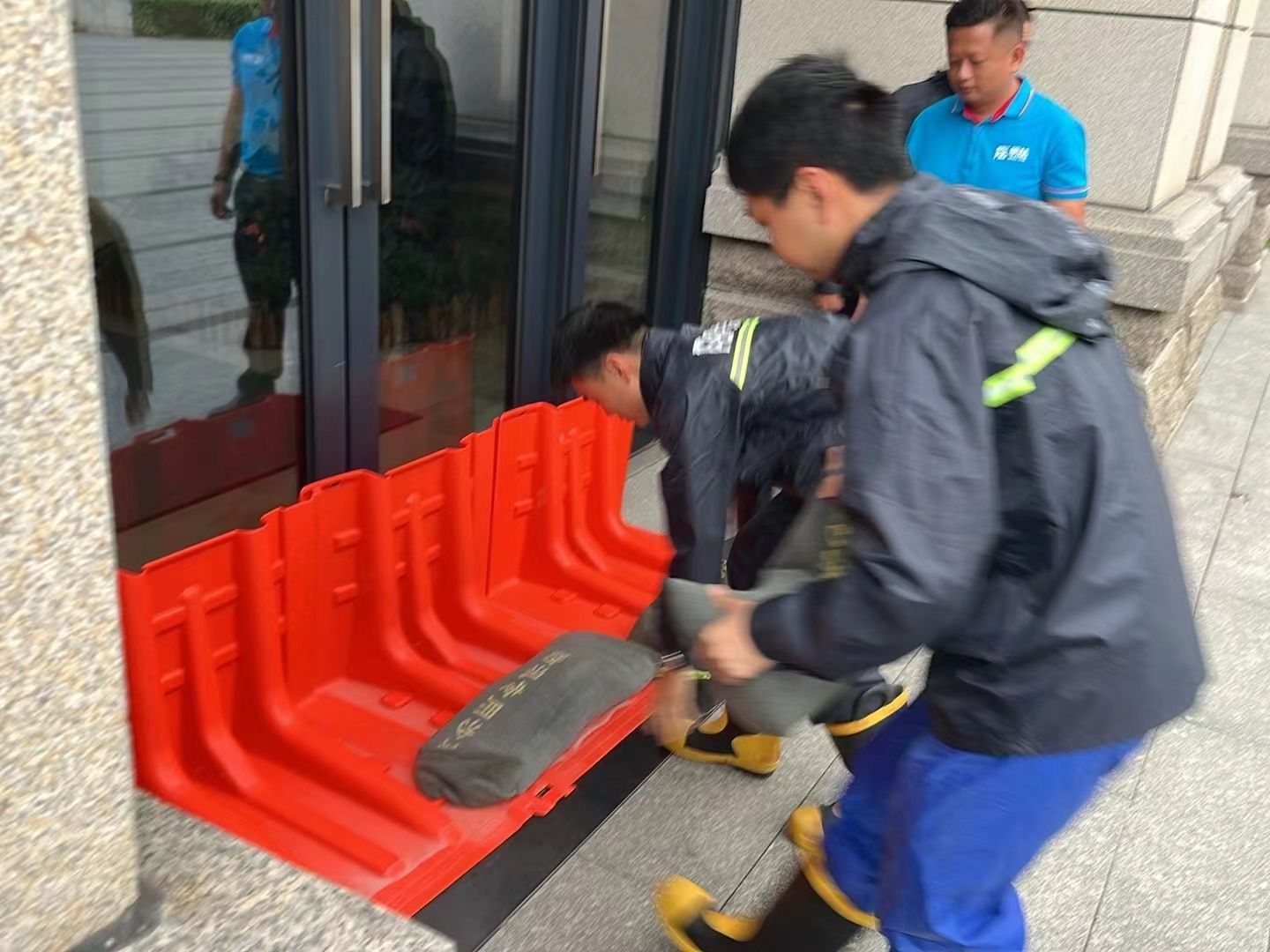场景四、在主楼南门,演练人员利用移动式防洪挡水板配合沙袋进行围堵。挡水板与沙袋的完美结合,有效阻挡了洪水的侵袭,保护了主楼的安全。