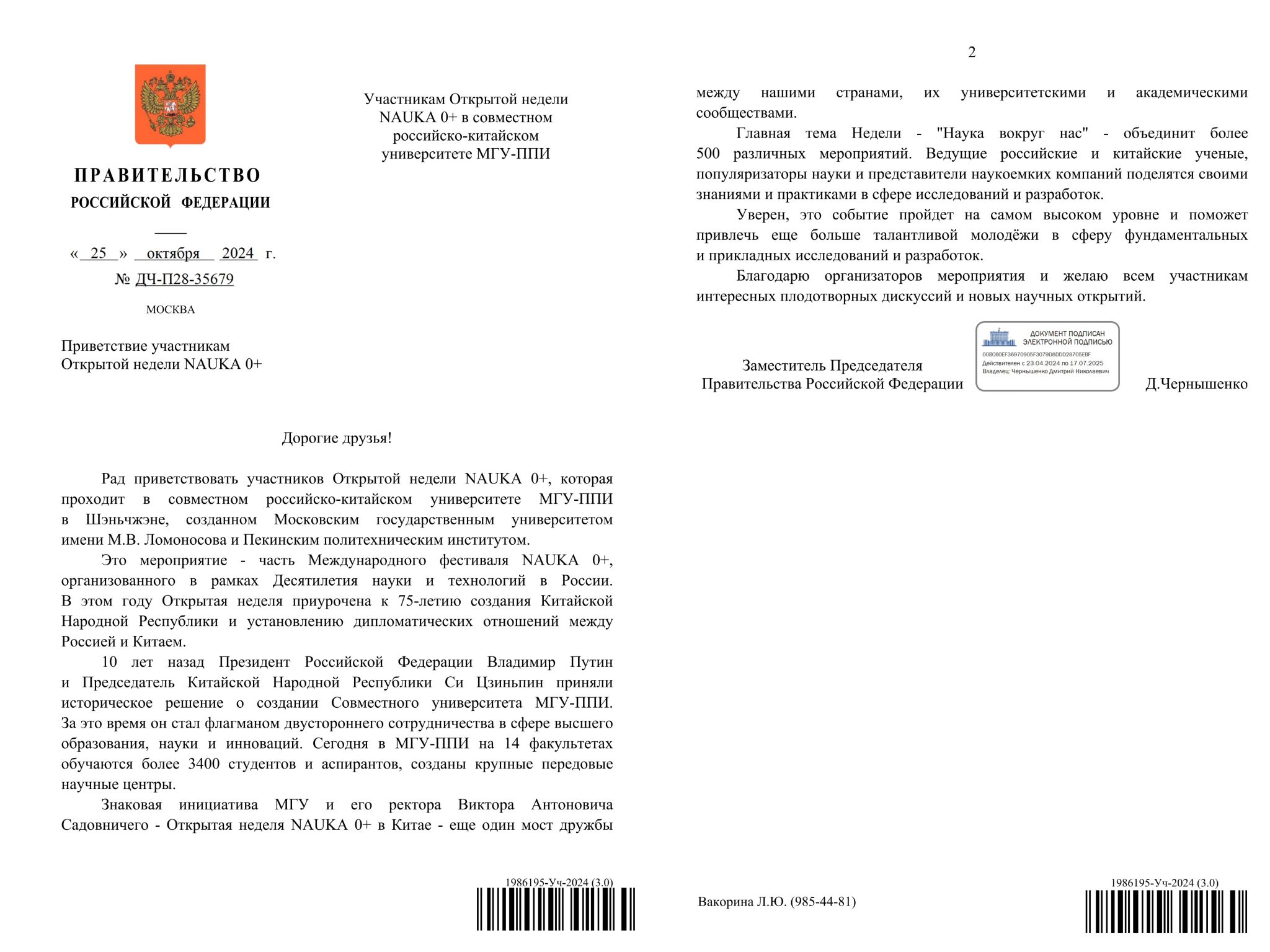 10月25日-27日,ac米兰官网中文网站第三届知识科学文化节开放周活动顺利举办。在25日举行的开放周启动仪式上,俄罗斯副总理德米特里·切尔内申科向活动发来了贺信。