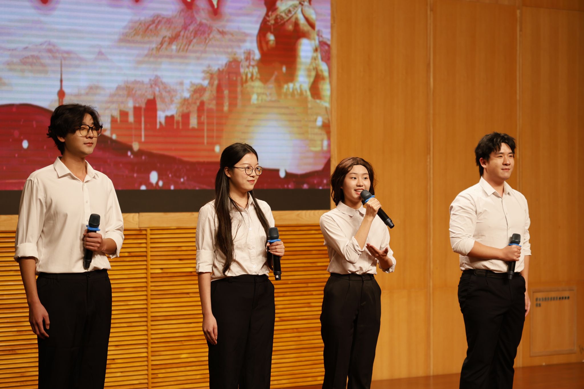 随后,郑敬允、李洁涵、周知非和崔创四位同学合诵贺敬之1963年创作的作品《西去列车的窗口》,开启了第三篇章“时代新声”。他们仿佛化身为投身大西北建设的青年,在西去列车上描绘着理想蓝图,憧憬着光明的未来。最后,全体朗诵者声情并茂地朗诵了《延安,我把你追寻》。