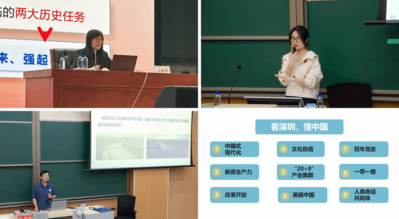 推动党的创新理论的专家化解读、青年化阐释和三语式表达,是《看深圳·懂中国》特色思政课在“理论学习”环节的探索方向。《看深圳·懂中国》特色思政课在课程表达上,构建了一支由校团委、马克思主义学院和学生工作部组成的课程团队,推动多部门协同联动、多类型人员共同备课,提升了理论学习的理论性、亲和力。课程内容强调以深圳建设中国特色社会主义先行示范区为设计主线,设计由改革开放、文化自信和中国式现代化等组成的9大专题理论课,让思政课理论学习更针对深圳的大学生,更符合中外合作办学特色,丰富了中外合办高校思政课教学素材库。
