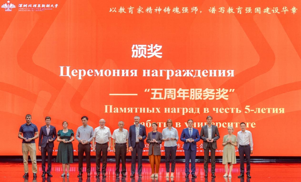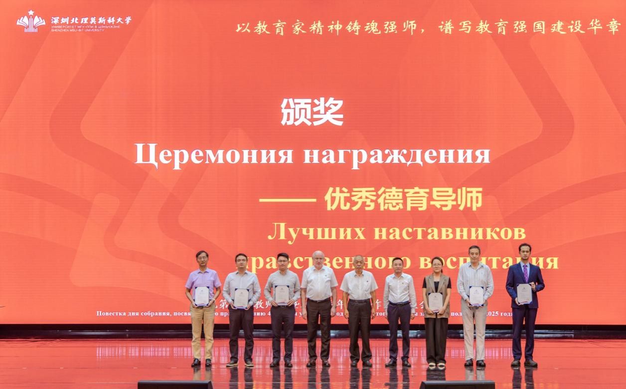 会上,陈超峰宣读表彰决定:授予伊柳特科·维克托·彼得罗维奇等27名教职工“五周年服务奖”;授予列杰涅夫·亚历山大·弗拉基米罗维奇等118名教职工“2024年度考核优秀等次人员”荣誉称号;授予赵延孟等13名教职工“2024年度优秀德育导师”荣誉称号;并通报学校入选2025年“南粤优秀教师”和“南粤优秀教育工作者”的表彰人选:萨马廖娃·叶连娜·维克托罗夫娜获评2025年“南粤优秀教师”,谢欢欣获评“南粤优秀教育工作者”。随后,校领导们为获得“五周年服务奖”和“2024年度优秀德育导师”的教职工颁奖,以表彰先进、树立榜样。