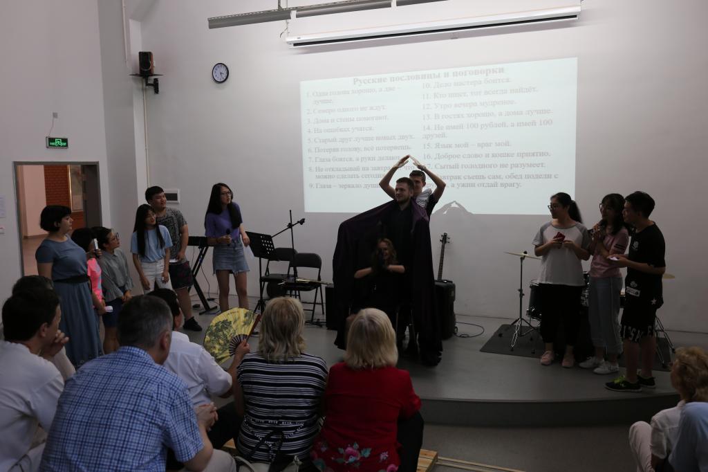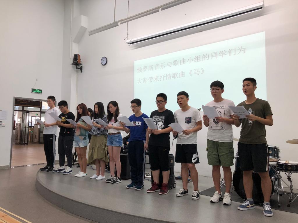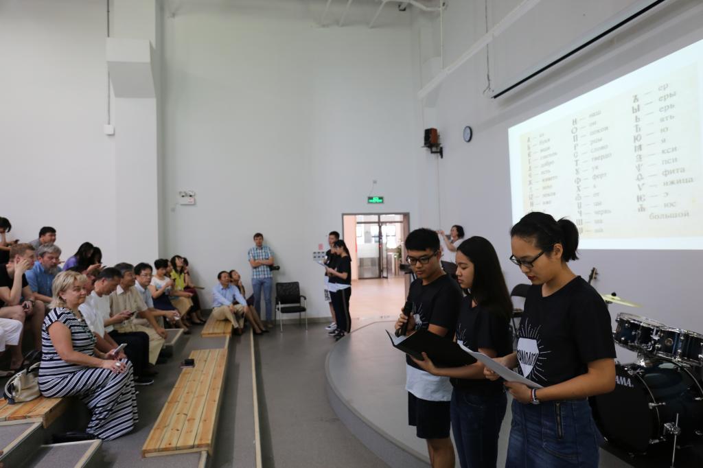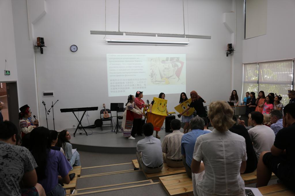 活动的第二部分是庆祝5月24日俄罗斯法定的斯拉夫文字文化节。这是纪念斯拉夫文字的创始人圣基里尔和梅福季兄弟的日子。基里尔和梅福季创立的基里尔文字是斯拉夫各民族语言形成的基础,除了俄罗斯,乌克兰、白俄罗斯、保加利亚等国也使用基里尔文字。在俄罗斯,每年5月24日全国各地都举行丰富多彩的活动来庆祝这一节日,帮助人们、尤其是年轻人更多了解自己的历史,提升青少年的阅读兴趣。围绕这一主题,本次活动设置了一些有趣的词语配对及问答竞赛,让同学们在活泼的气氛中了解现代俄语由斯拉夫语的演变。“书籍教会我们善良,书籍给予希望和力量……”俄语专业的本科生用俄语朗诵了现代诗人莉莉娅·奥霍德尼茨卡娅的诗作。随后音乐小组的同学们演唱了抒情歌曲《马》和欢快的《大学生之歌》。