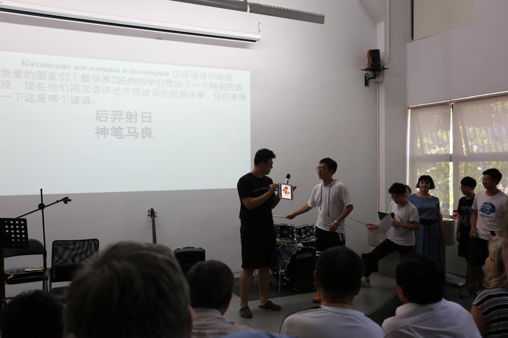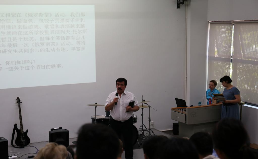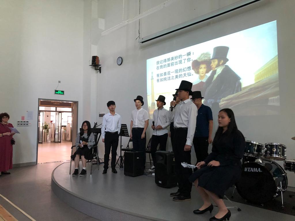活动的最后一部分围绕6月6日普希金诞辰日展开。普希金是俄国现代文学的奠基人,被誉为“俄国文学之父”,是俄罗斯最伟大的诗人之一。2010年联合国宣布6月6日为“俄语日”。作为热爱俄罗斯语言文化的一份子,同学们用自己独特的方式来庆祝这一节日。“假如生活欺骗了你,不要悲伤,不要心急!忧郁的日子里须要镇静:相信吧,快乐的日子将会来临!……” 《游遍俄罗斯》小组的同学们带领大家一起徜徉于普希金的经典诗句中,一起感受普希金诗歌带给我们的心灵震撼。俄罗斯籍本科生对普希金作品《石客》中的片段进行了精彩的演绎,数学系的同学们策划了有趣的谚语猜谜游戏,特别是俄罗斯教师巴萨拉巴和摩尔古诺娃激情澎湃地演唱《一百个朋友》,感染了在场的每位师生,优美的歌声、热烈的掌声、欢呼声久久回荡在会场……