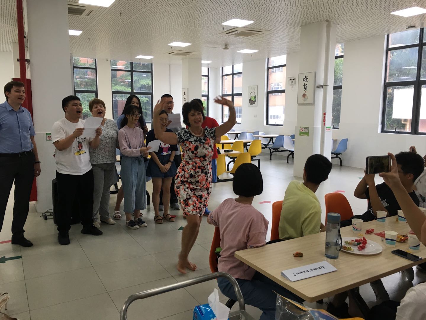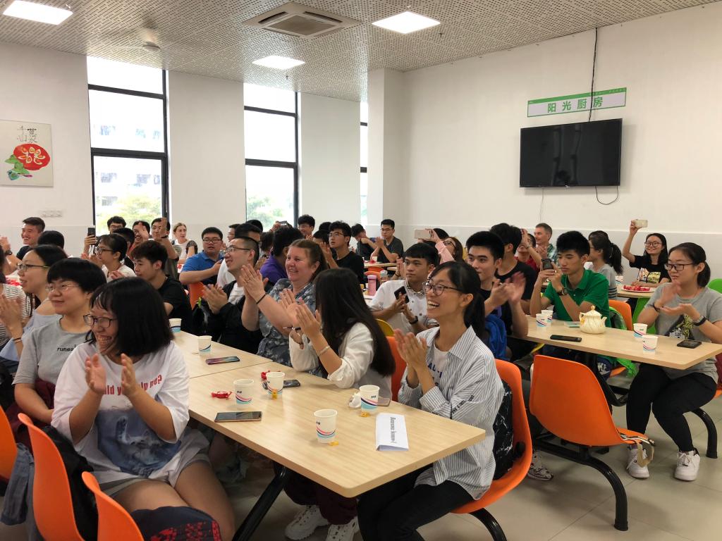 学术部部长卡尔梅科夫为大家高歌一曲《长长的路》,美妙的歌声让人仿佛置身莫斯科大剧院。2017级本科生助教与俄罗斯老师一起演唱了大家耳熟能详的俄罗斯歌曲《喀秋莎》,科罗特科娃老师更是伴着歌声即兴献舞,为同学们制造了一份意外的惊喜,现场气氛热烈。