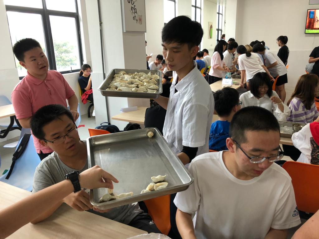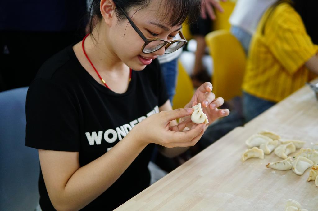 同学们洗净双手,在俄罗斯老师的带领下欢快地忙活起来。大家一起研究着花式包饺子方法,讨论着甜馅口味的俄式饺子,互相分享趣事,现场到处洋溢着欢声笑语。