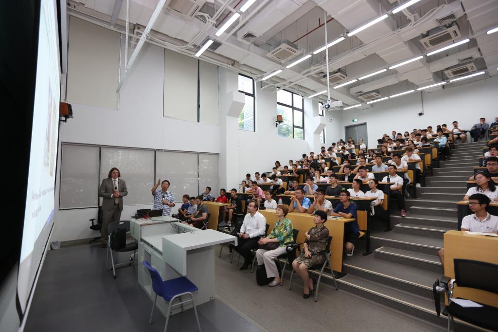 伊里金通讯院士是俄罗斯著名的控制论专家,有非常高的数学造诣。他从对世界数学发展史的简要回顾,特别是俄罗斯对数学学科发展的贡献,让学生充分认识到社会需求是数学发展的原动力。伊里金通讯院士同时也为学生展示了数学在材料、经济、语言、生物领域的广泛应用。为了让讲座更有效果,学校特别邀请华东师范大学教授倪明康担任翻译和解说。伊里金通讯院士与倪明康教授配合默契,整场讲座深入浅出、博引旁征、内容丰富、风趣幽默,为学生提供了一场数学的饕餮盛宴。