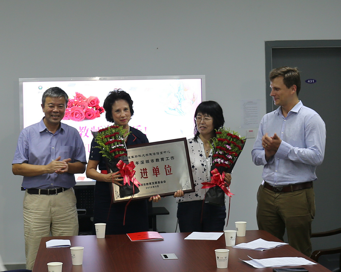 今年,我校首次参加广东省和深圳市教育系统的评优选先活动,俄语中心的基尔扎诺娃老师荣获“广东省南粤优秀教师”称号,俄语中心荣获“深圳市教育工作先进单位”称号。赵平校长与塔拉索夫执行第一副校长分别为基尔扎诺娃老师和俄语中心颁发奖状。