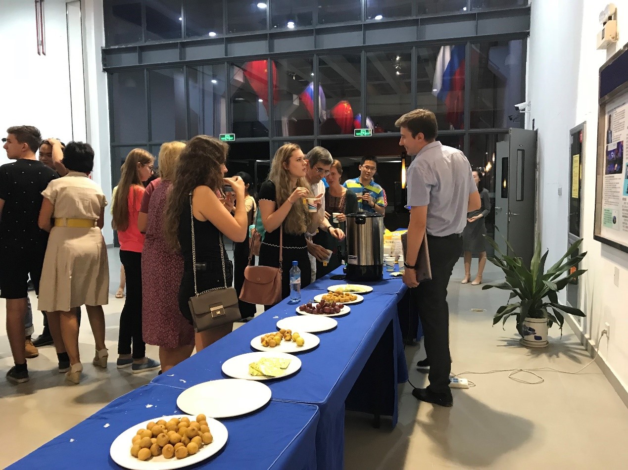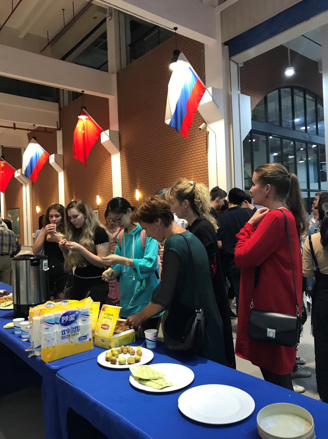 (学术部长卡尔梅科夫与俄罗斯留学生亲切交谈)