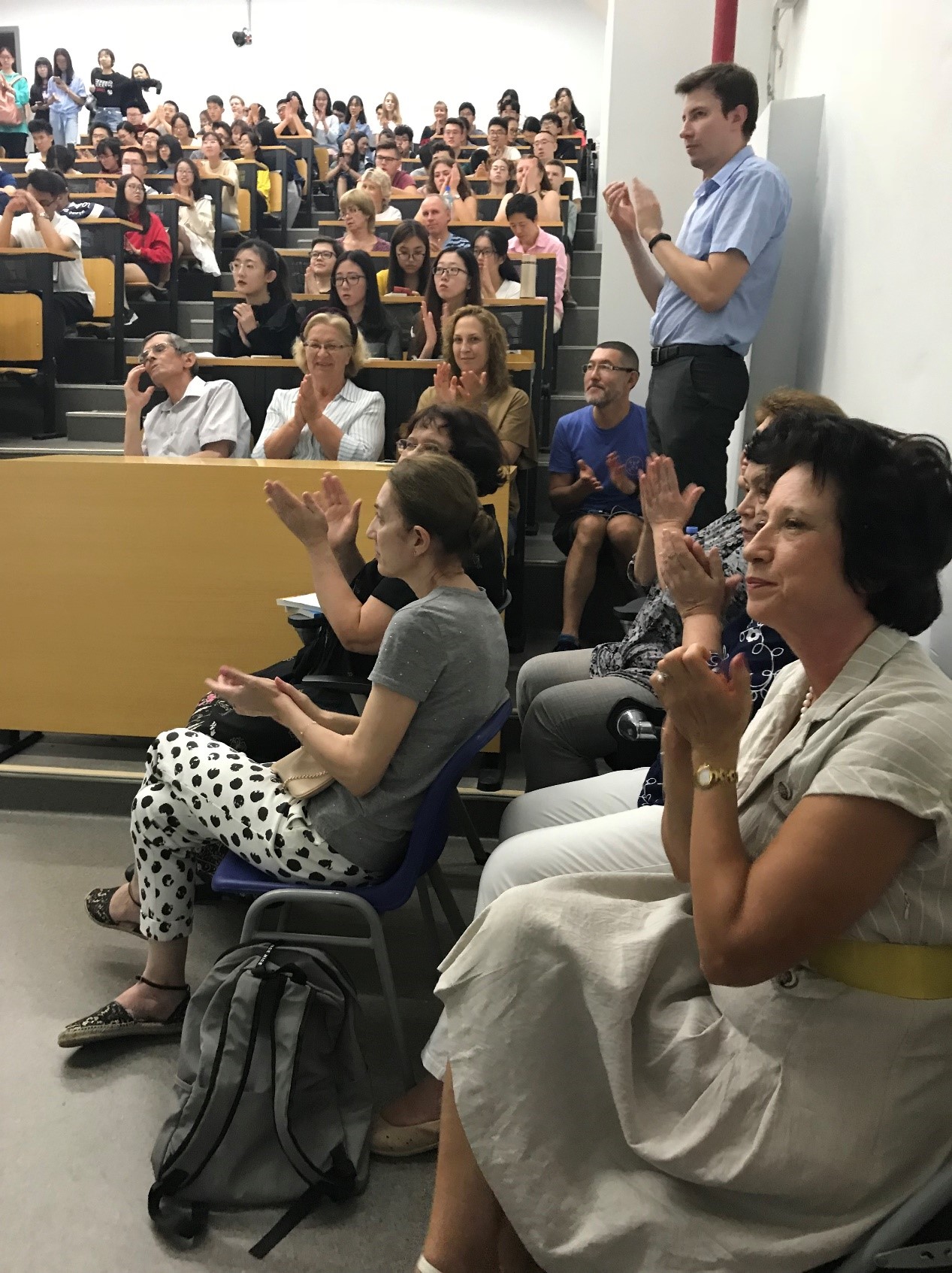 (所有与会教师聚精会神地听学生们朗诵诗歌)