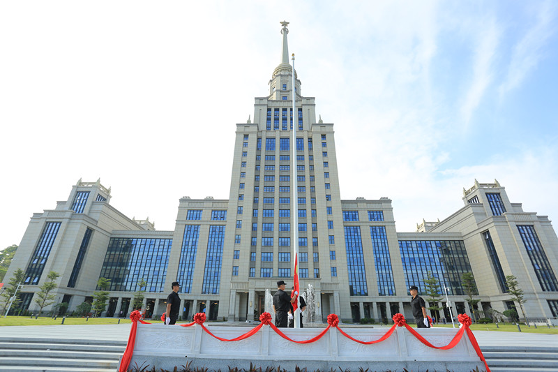 随后,唐水源校长、陆万伟书记和阿列克谢·塔拉索夫副校长在学校主楼一楼大堂前为新校区剪彩,并在欢呼声中推开了大堂大门,宣告学校正式入驻。