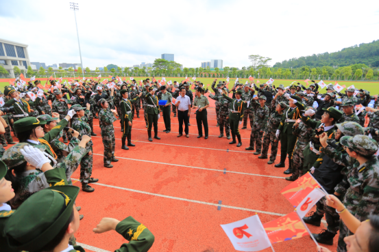 随后,2019级全体学生充满深情地合唱了《我爱你中国》。在悠扬的旋律中,学校领导和部分教师走下观礼台,来到学生当中,与大家齐声合唱。唐水源校长表示,同学们的展示和表演非常精彩,让人感动。今年恰逢中华人民共和国成立70周年,同学们要为自己身为一名中国学子感到自豪,同时也希望同学们站在这一重要的历史节点,能深入思考如何将个人目标和祖国发展相结合,以饱满的精神投入到新学期的学习和生活中去。