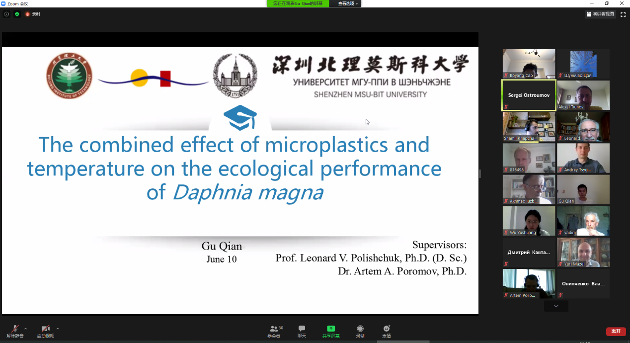 受疫情影响,本次答辩采用Zoom远程会议软件组织开展,答辩评审组成员由包括一名俄罗斯通讯院士在内的12人组成,另有25位莫斯科大学专家教授及9名外部评审人出席了答辩,参加答辩会议的还有莫斯科大学副校长及ac米兰官网中文网站多名教学部门领导及管理人员。同时,生物系目前在读硕士研究生一年级的学生也被邀请列席观摩答辩。