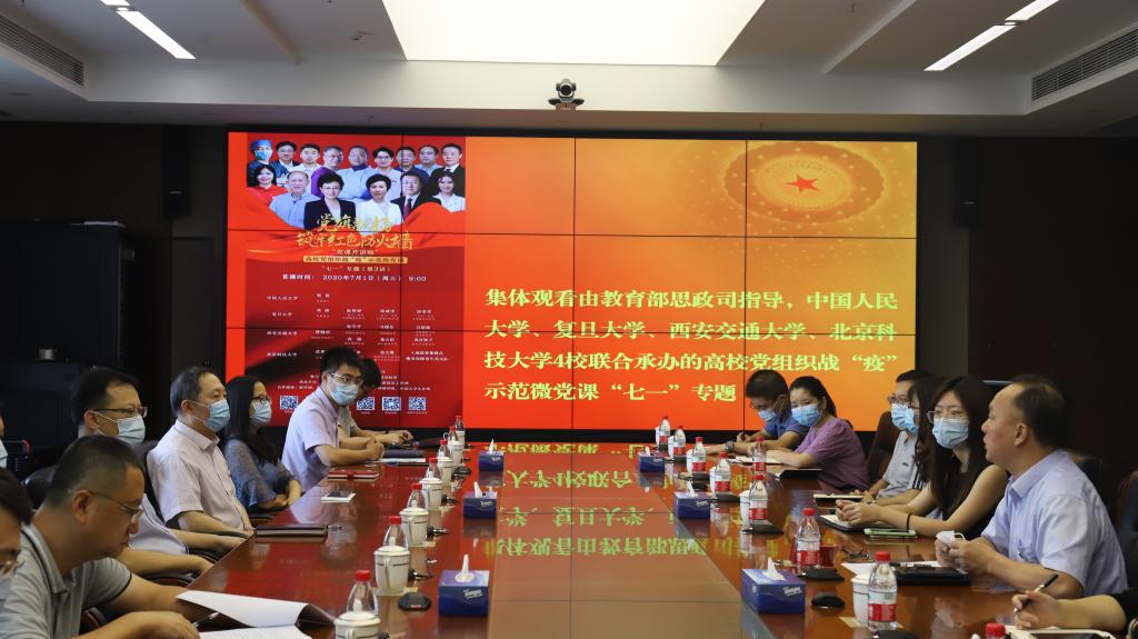 全体党员和入党积极分子在现场集中观看了由中国人民大学、复旦大学、西安交通大学和北京科技大学四校联合开讲的高校党组织战“疫”示范微党课“七一”专题活动。