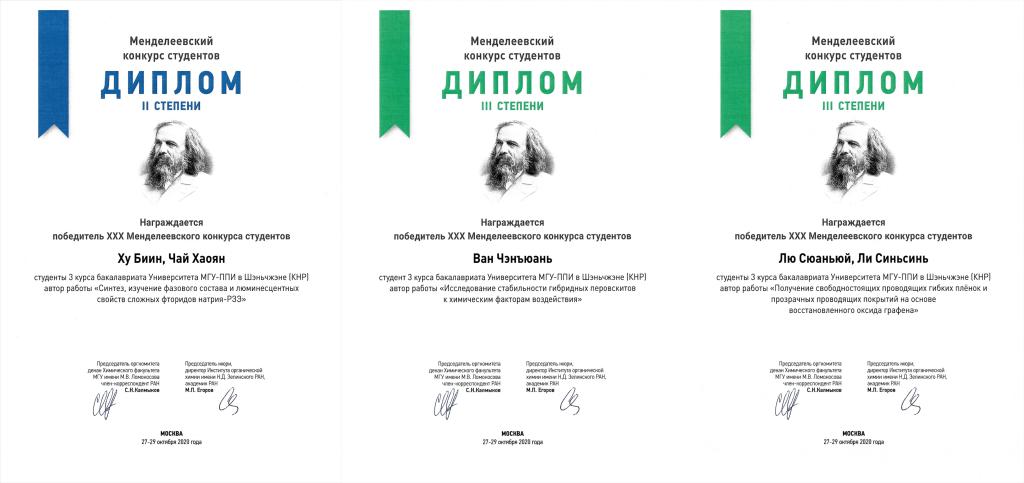 10月27日至29日,第三十届门捷列夫化学竞赛以远程视频的形式顺利举行。ac米兰材料科学系胡碧滢同学以《氟化钠-稀土复合物的合成、相组成和发光性能的研究》获得《化学研究》类二等奖;王程远和刘轩宇两位同学获得三等奖,他们的研究课题分别是《钙钛矿杂化物稳定性对化学作用因子的研究》和《基于还原氧化石墨烯的自支撑导电柔性膜和透明导电涂层的制备》。
