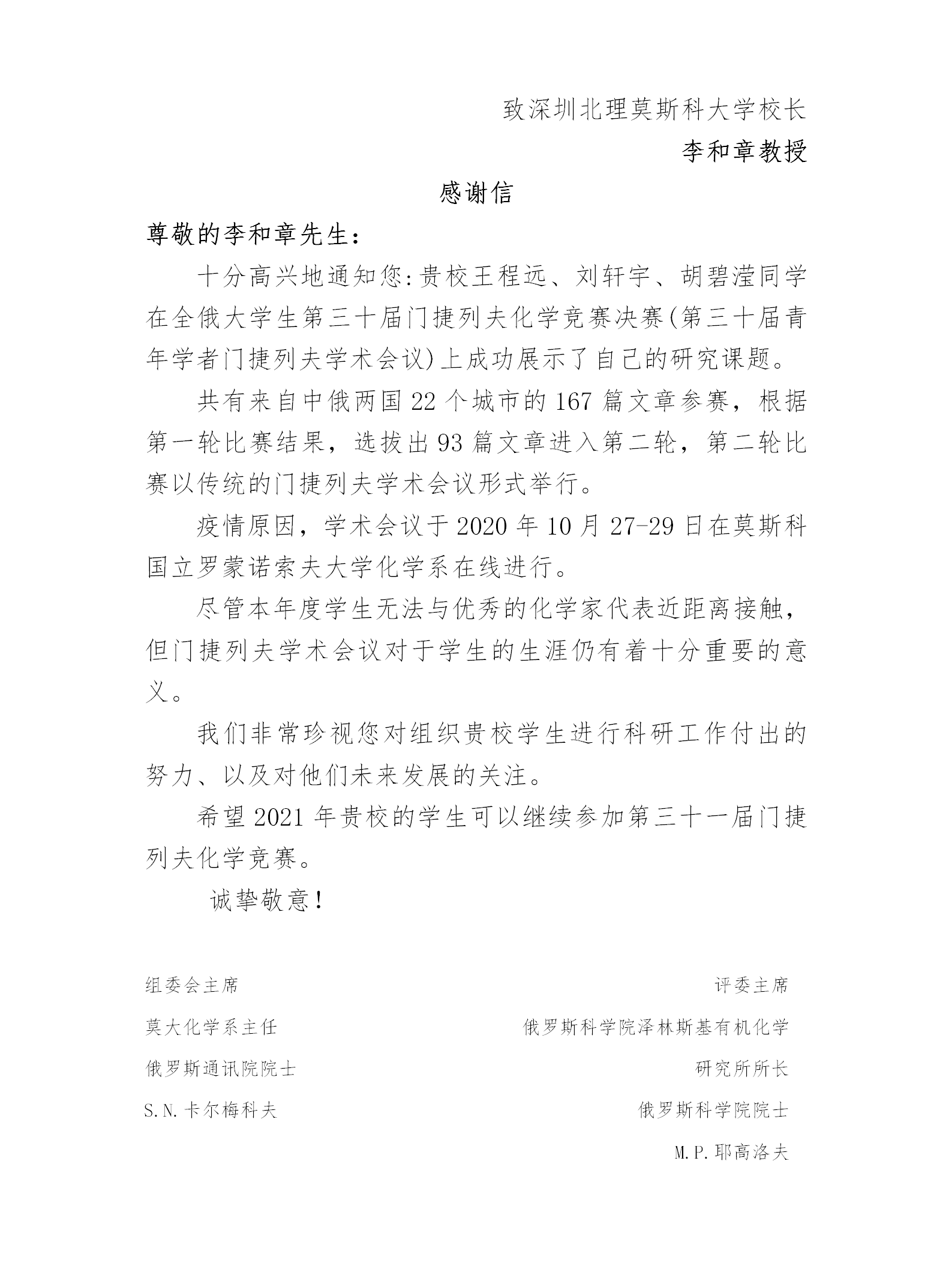 近日,第三十届门捷列夫化学竞赛组委会主席、莫斯科大学化学系主任、俄罗斯通讯院院士、ac米兰官网中文网站董事会主席S.N.卡尔梅科夫,第三十届门捷列夫化学竞赛评委主席、俄罗斯科学院泽林斯基有机化学研究所所长、俄罗斯科学院院士M.P.耶高洛夫向ac米兰官网中文网站李和章校长致感谢信,祝贺学校材料科学系王程远、刘轩宇、胡碧滢三位同学在全俄大学生第三十届门捷列夫化学竞赛决赛(第三十届青年学者门捷列夫学术会议)上成功展示了自己的研究课题,对学校组织学生进行科研工作所付出的努力,以及对学生未来发展的关注表示感谢。