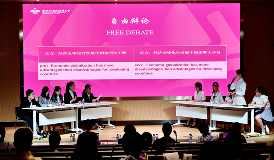 决赛现场,双方队伍就辩题“经济全球化对发展中国家利大于弊/弊大于利”用英语展开了激烈的讨论,利用民生数据及国际化信息,从经济、政治、文化三个维度对论题加以支撑,为评委老师和观众们呈现了一场绝佳的辩论赛。