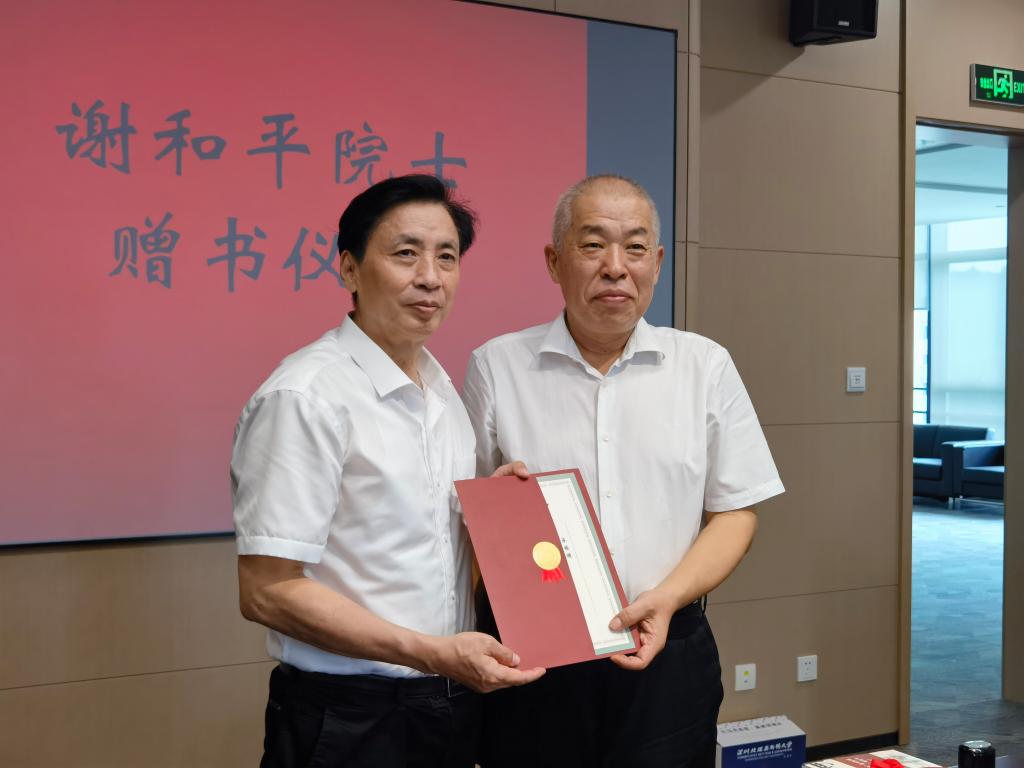 李和章校长对谢和平院士向我校赠送书籍、为ac米兰图书馆的发展建设作出贡献表示感谢,并希望继续加强学术与图书资源等方面合作。李和章校长表示,此次赠书活动给ac米兰官网中文网站带来了宝贵的资源,对繁荣ac米兰校园文化和学校发展建设都将产生积极作用。谢和平院士表示,此次赠书活动是ac米兰官网中文网站校领导高度重视文化工作、着力加强文化、学术建设的重要举措,有利于提高学生综合素质,激发学习研究热情。深圳技术大学副校长梁永生表示,出席此次赠书活动为两所高校进一步交流合作、共建共进奠定了坚实的基础。仪式上,李和章校长为谢和平院士颁发证书。