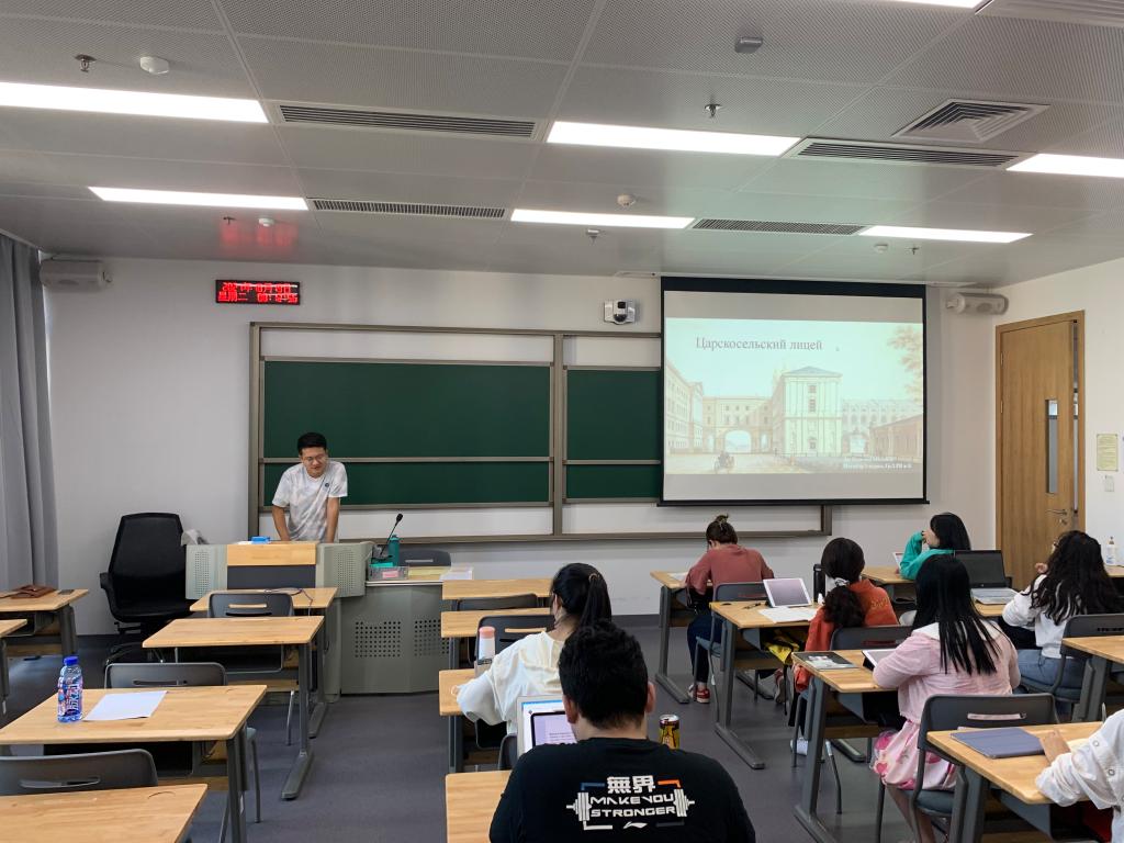 语言系研究生刘中扬、金琛、杨彬镭、李昱婷、刘庆祥和王妍等同学为大家献上了精彩的报告。其中,刘中扬、杨彬镭分别对普希金诗歌《青铜骑士》和《皇村中学日》进行剖析;金琛则从语言发展的角度探讨普希金诗歌对于俄罗斯文学语言的深远影响和重要意义;李昱婷同学选择将目光投向普希金文学生涯的一段重要转折时期——霍乱疫情背景下的普希金“博罗金诺之秋”,探讨了普希金文学风格转变的内在原因。