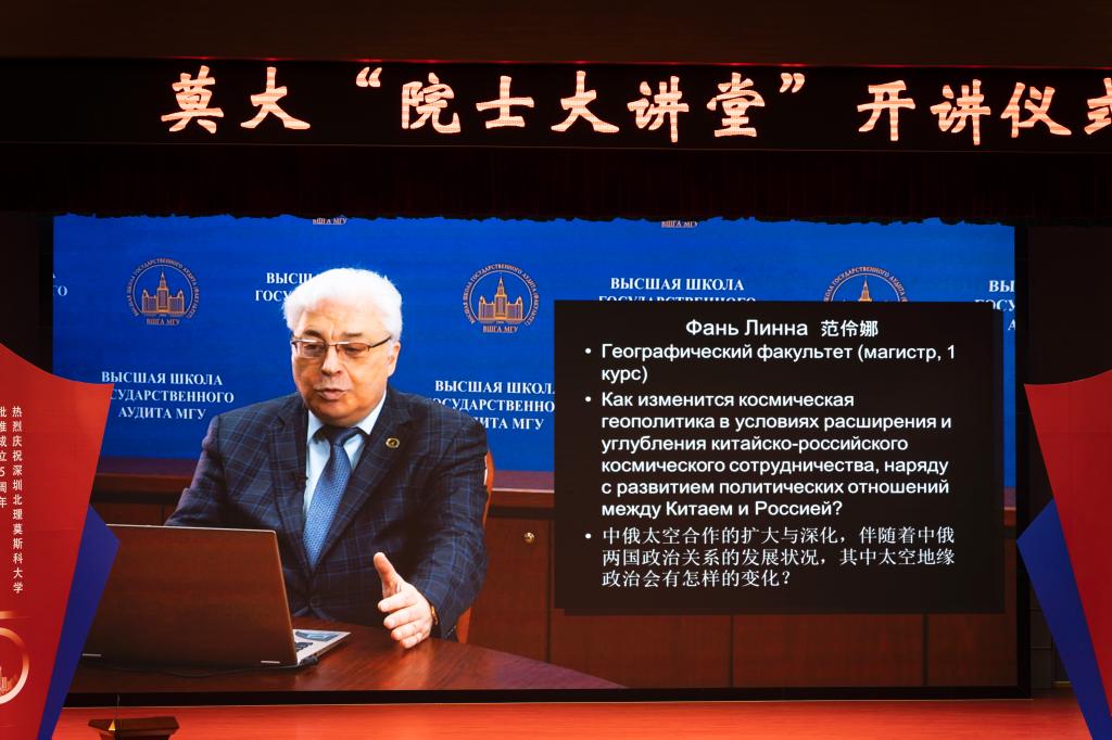 在讲座过程中,尤里•巴图林院士对同学们提出的部分代表性问题进行了详细的解答。在回答范伶娜同学提出的“中俄太空合作的扩大与深化,伴随着中俄两国政治关系发展状况,其中太空地缘政治会有怎样的变化?”的问题时,尤里•巴图林院士认为,这个问题涉及地缘政治问题和天缘政治问题。在地缘政治上,中俄太空合作毫无疑问将影响地球的规模和范围。但天缘政治才刚刚开始,如果中俄两个能在这个阶段强强联手,将对未来整个天缘政治的发展产生重大影响。