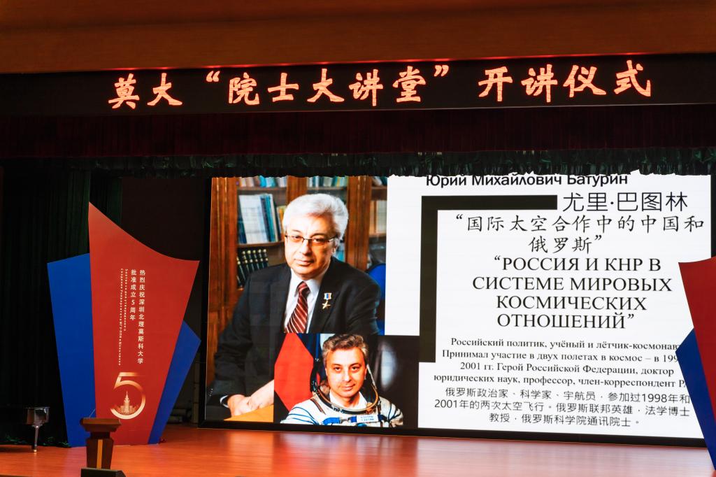 俄罗斯政治家、科学家、宇航员,俄罗斯联邦英雄、法学博士、教授、俄罗斯科学院通讯院士尤里•巴图林作题为“国际太空合作中的中国和俄罗斯”的首场讲座。