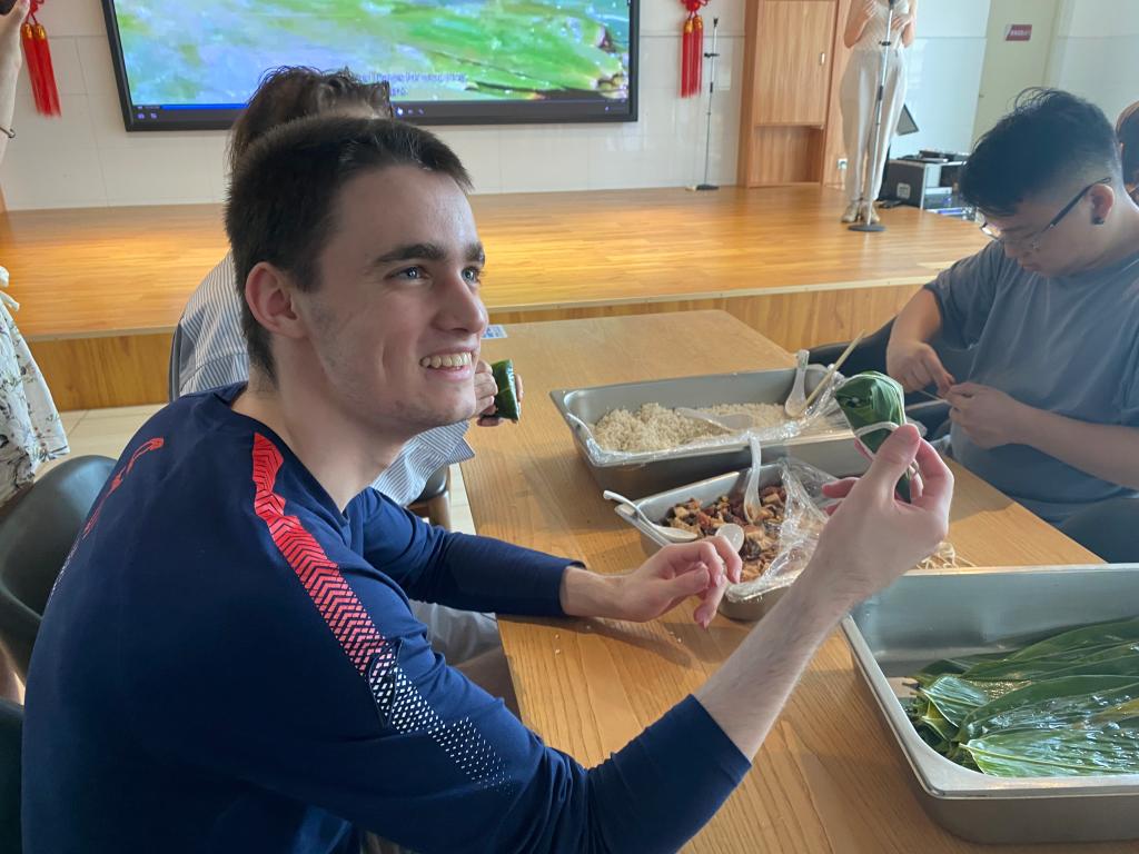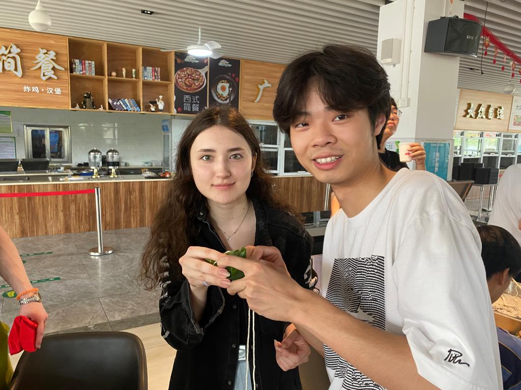 活动中,中俄学生们通过视频展示观看了“端午节的风俗与来历”的相关视频,知道了端午节的来历以及节日的独特风俗,如:吃粽子、赛龙舟、挂香袋等庆祝活动,让学生了解屈原的故事,视频演示过程中来自俄罗斯的Kate Kuprekova同学同步用俄语为大家进行了讲解。 随后,食堂的何经理和阿姨们现场演示包粽子的手法,折叶、盛料、压实、裹叶、扎绳……同学们在他们的指导下一步一步将食材变成各式各样的粽子,通过亲自动手包制粽子让中俄学生更真切得去感受中国传统节日内涵。