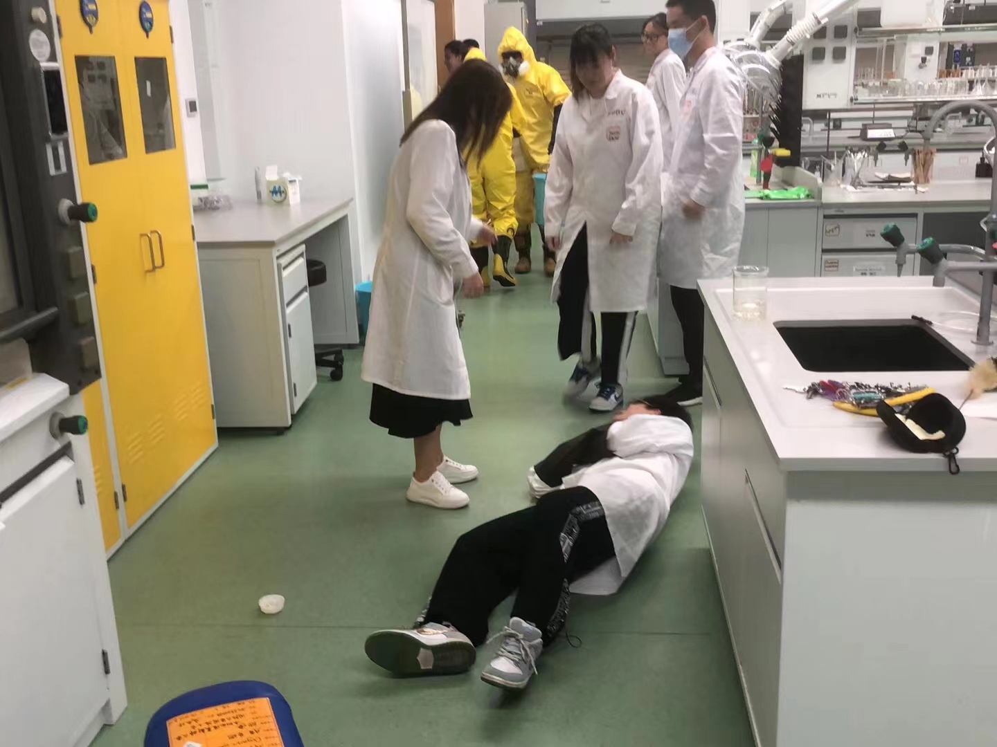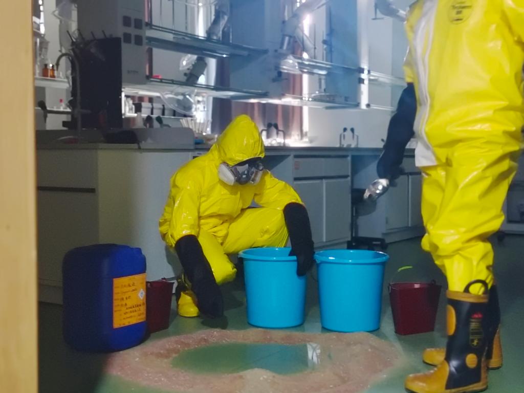 在1# 实验楼 209房间,操作者在进行化学废弃物回收时发生腾涌、喷溅并灼伤,慌乱中跌倒,碰倒废液桶引发泄漏,发出呼救。现场人员及时施救,迅速上报,通知人员疏散,并启动“ac米兰官网中文网站环境事故应急预案”,应急指挥及危化品泄漏处置人员迅速就位,进行处置。因挥发性气体自燃,引起现场失火,学校立即启动“ac米兰官网中文网站灭火和应急疏散预案”。校消防队赶赴火场,开展灭火救援并报119火警。楼内火灾警报响起,电源切断;消防应急总指挥到现场实地指挥;现场拉起警戒线,安全警戒及疏散引导组组织楼内人员有序疏散;医疗救护组开展伤员紧急处置; 全楼人员有条不紊,忙而不乱,迅速疏散到楼外。