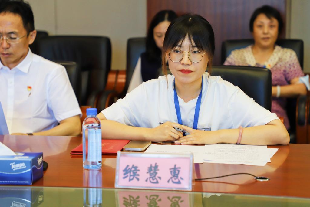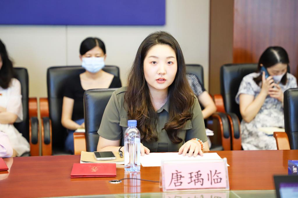 学生第二党支部书记唐瑀临同志代表优秀党务工作者发言。她分享了作为一名基层党务工作者在开展学生党建工作中的所思所悟。她表示,作为一名基层党务工作者,要坚持以学生为中心,围绕学生因材施教,以育人为主责,挖掘特色思政元素,构建党建品牌,以学习为高招,学会用青年语言讲述百年党史和新中国发展故事,做好青年党员们的热心人、知心人。