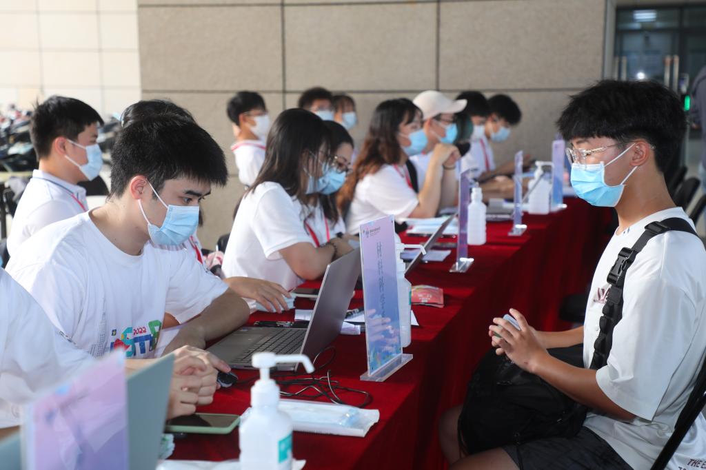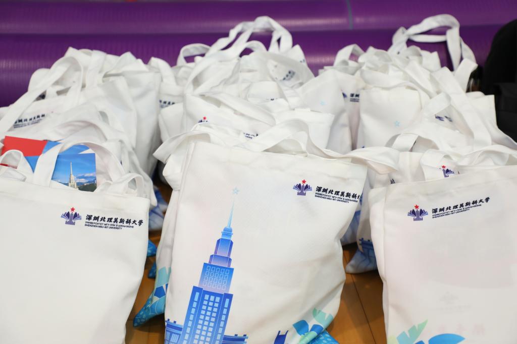 在报到现场,每位新生均可领取到一份“新生礼包”,其中包括环保袋、校徽、文创雨伞、《新生手册》以及彩色文化衫。学校还为申请“绿色通道”的新生准备了行李箱,内含水杯、文具等各种学习和生活物品。