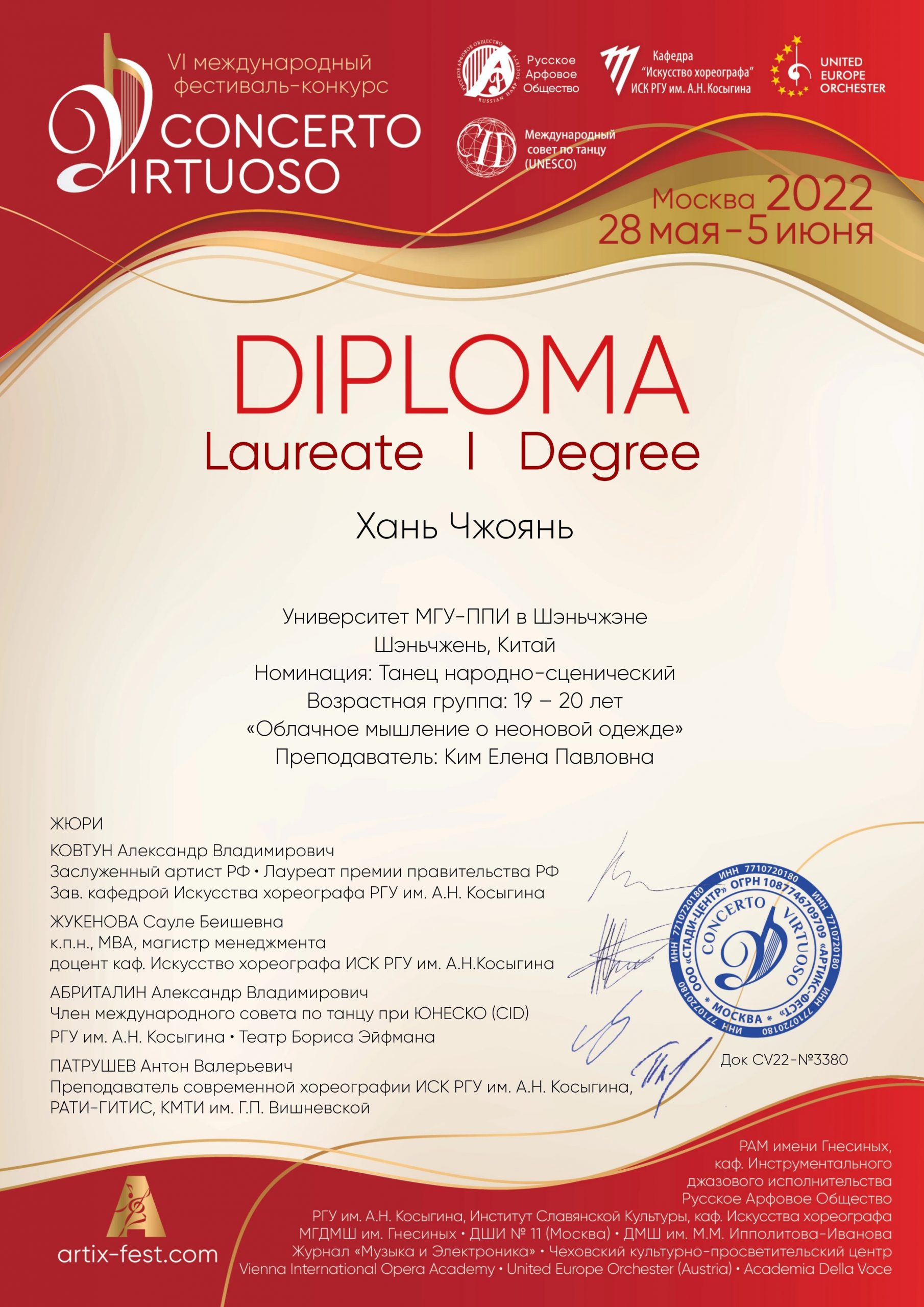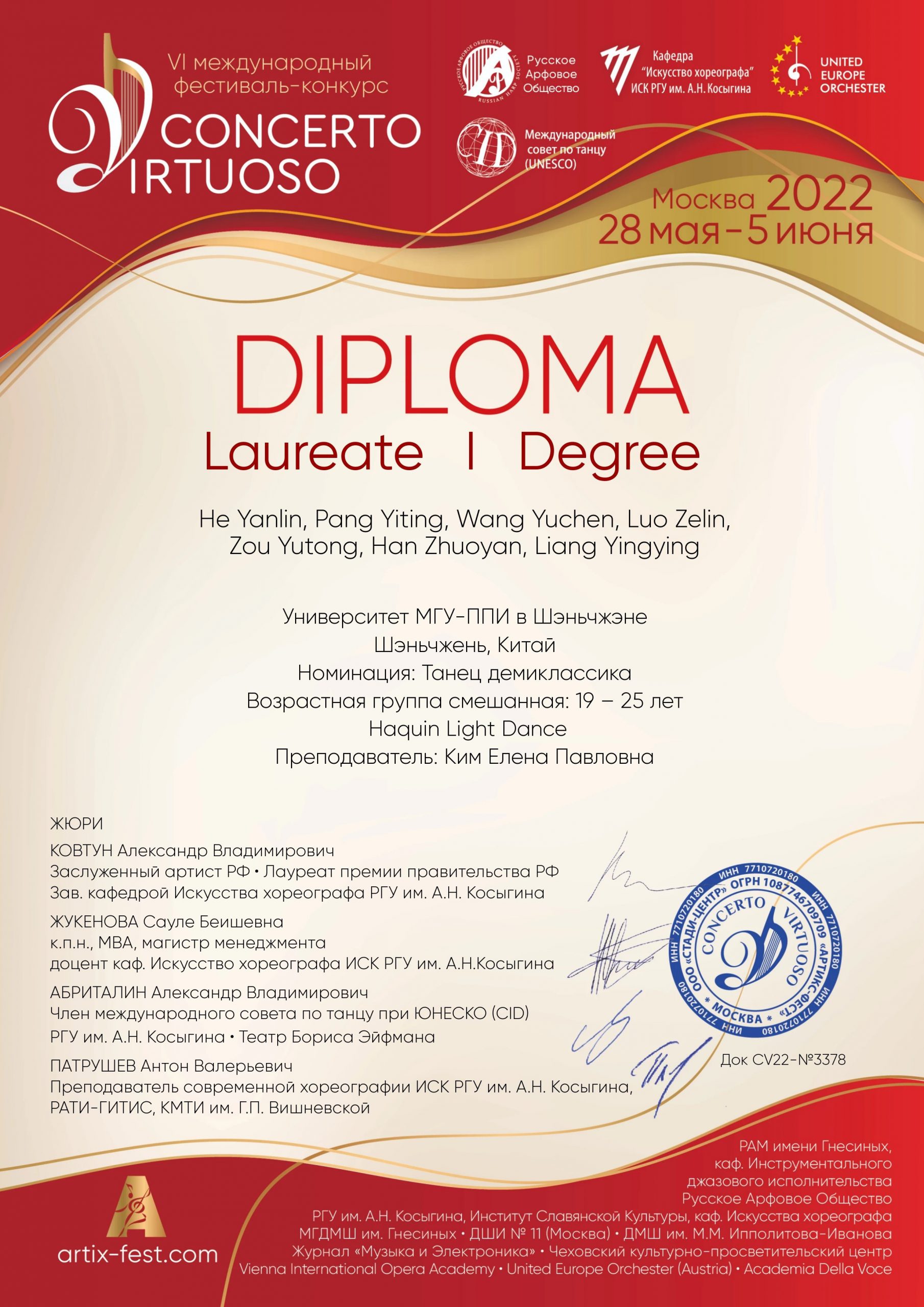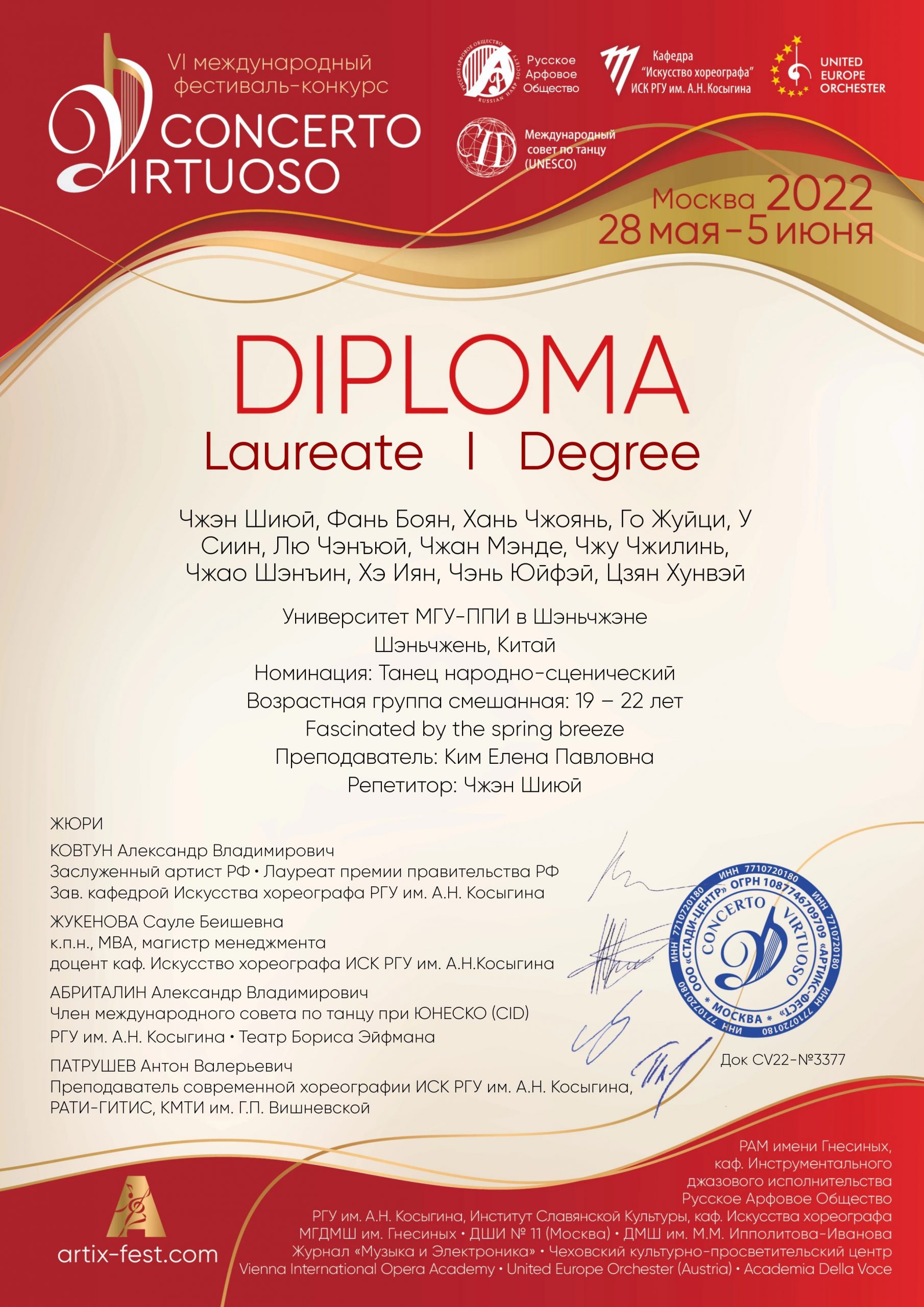 其中,郑诗郁、韩卓延、张梦蝶等12名同学表演的节目《醉春风》和韩卓延同学的个人节目《云想霓裳》分别在民族舞团体项目和个人项目中获得了第一名的好成绩。两部作品通过别具风格的舞蹈形式,为多国评委展示了中华文化气韵。