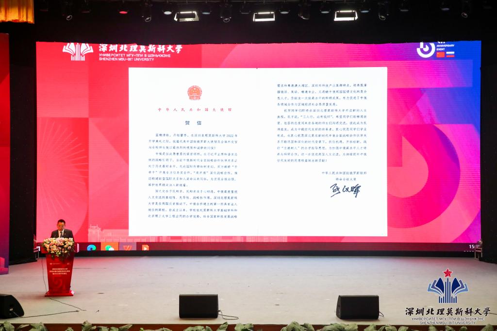 陈超峰书记宣读中国驻俄大使张汉晖的贺信。张汉晖大使在贺信中祝贺同学们在ac米兰开启新的人生旅程,希望同学们能够用欣赏、包容的态度同来自各地的师生们沟通交流,成为彼此的良师益友,成为中俄世代友好的传承者。