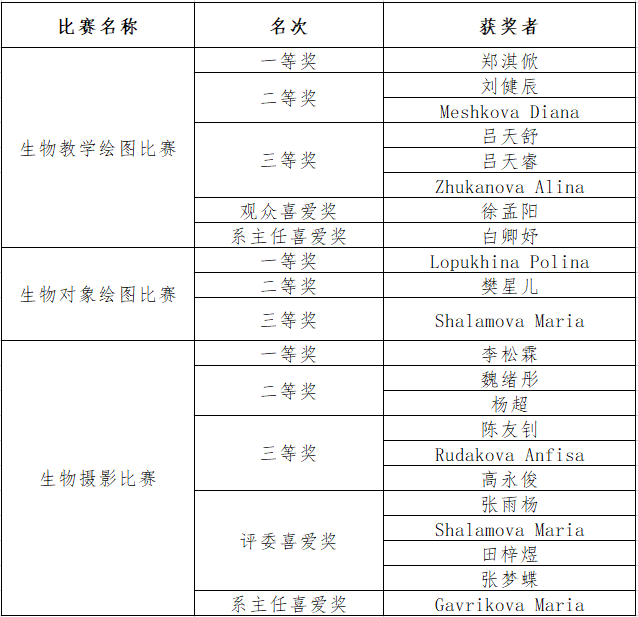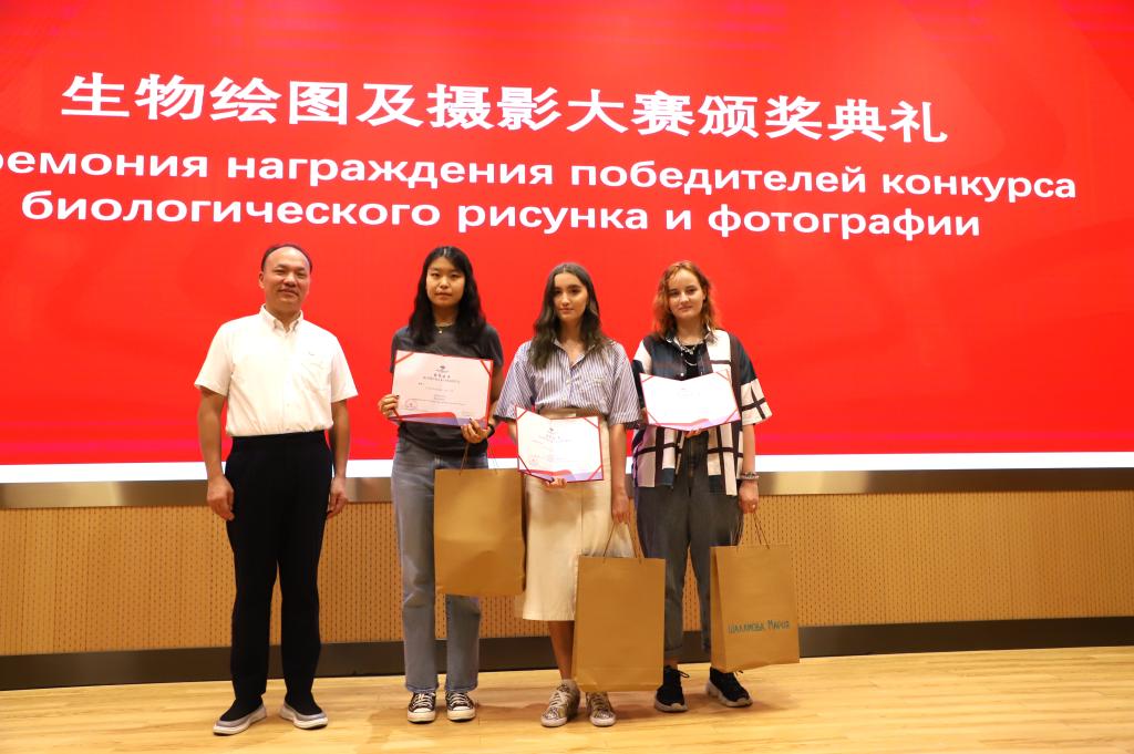 李和章、朱迪俭和陈超峰分别颁发了生物教学绘图比赛、生物对象绘图比赛和生物摄影比赛的一、二、三等奖;基塔绍夫颁发了绘图比赛的“观众喜爱奖”和“系主任喜爱奖”。生物系副主任冀四梅颁发了摄影比赛的“评委喜爱奖”和“系主任喜爱奖”。
