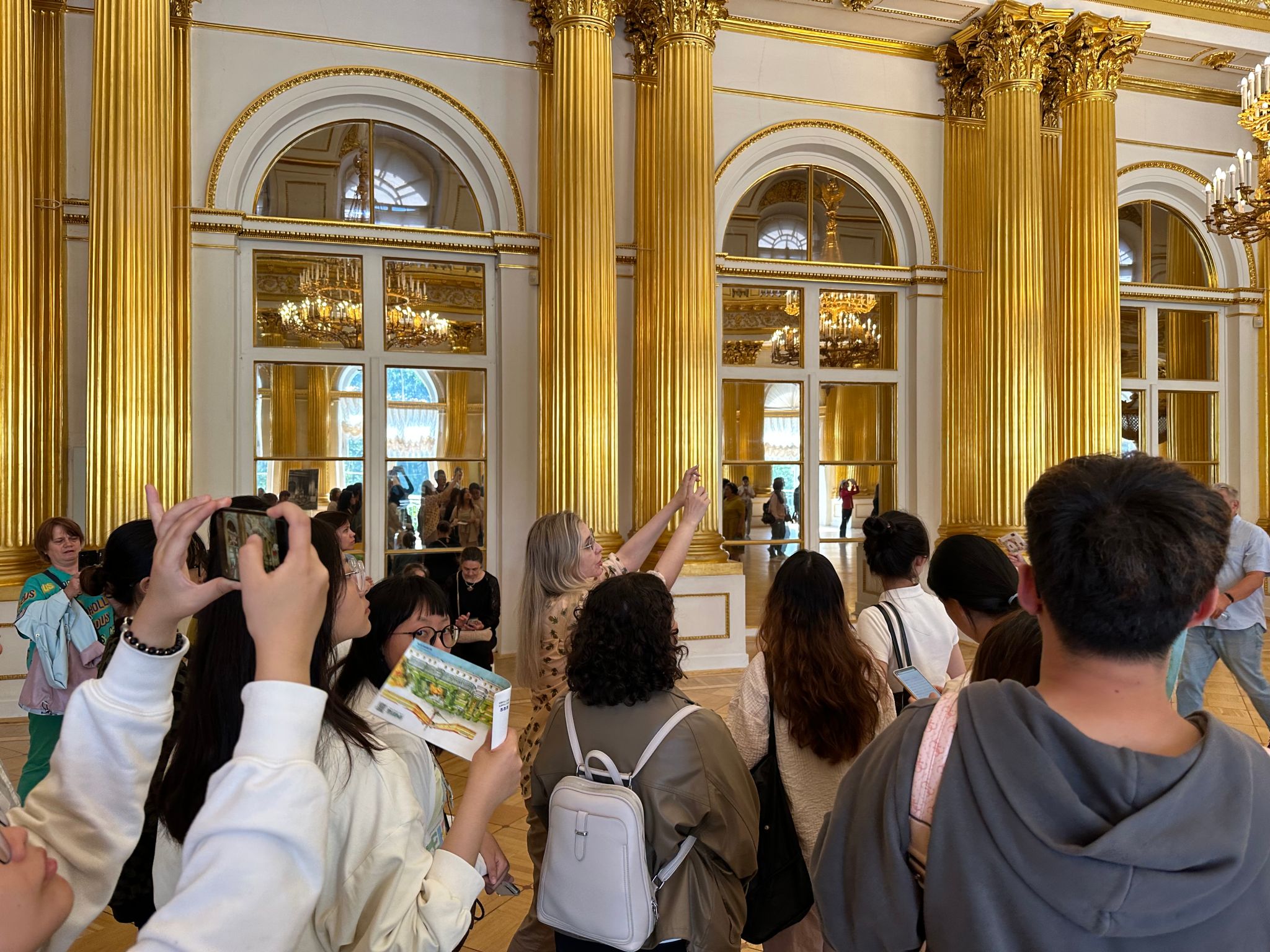 下午,同学们出发前往冬宫Зимний дворец。冬宫由俄罗斯女皇伊丽莎白下令建造,并于1754年建成。在导游耐心细致的讲解中,同学们游览了拉斐尔长廊、孔雀钟、兵器馆、王室服饰展等令人印象深刻的展览,感受到了独特的民族文化魅力。