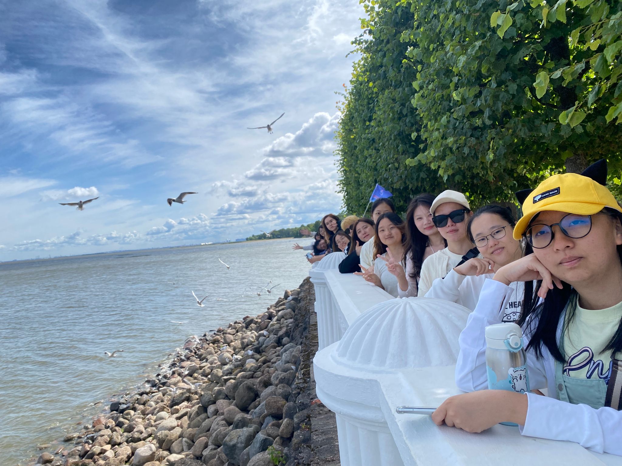再往深处走,穿过小花园,就可以看见芬兰湾,海鸥飞翔,碧波荡漾,在这里同学们可以眺望对岸的欧洲大地。返回出口回到瀑布喷泉的底部,同学们一起在这里合影留念。