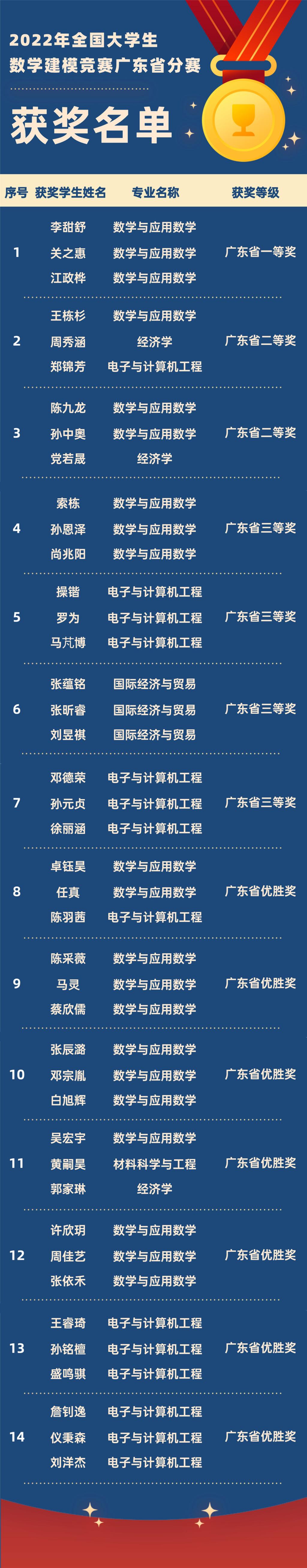 近日,2022年高教社杯全国大学生数学建模竞赛结果揭晓,ac米兰官网中文网站选派的参赛队伍分别荣获广东省一等奖1项、二等奖2项、三等奖4项及优胜奖7项。