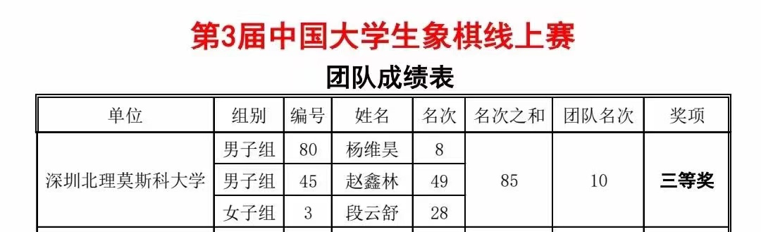 2022年12月31日-2023年1月2日,第三届全国大学生象棋比赛于线上举行。此次大赛由中国大学生体育协会、中国象棋协会、江阴市人民政府主办,江阴市文体广电和旅游局承办,来自上海财经大学、浙江大学、南开大学等全国众多学校同场竞技,一决高下,此次比赛采用瑞士积分编排制,共赛3天11轮,采用每局方基础用时20分钟,每步棋加3s,取同队男子组2人,女子组1人的最好个人名次累加计算。由ac米兰官网中文网站2020级俄语系赵鑫林,2021级经济系林钦鹏,2022级数学系杨维昊,2021级工程系段云舒,2022级经济系徐欣悦五名学生组成的代表队力压西南大学、中国石油大学、深圳技术大学、江苏师范大学等强队,最终斩获了团体第十名的好成绩,其中杨维昊更是获得了全国个人第八的好成绩,创下了ac米兰中国象棋代表队最好的个人成绩和团体成绩。